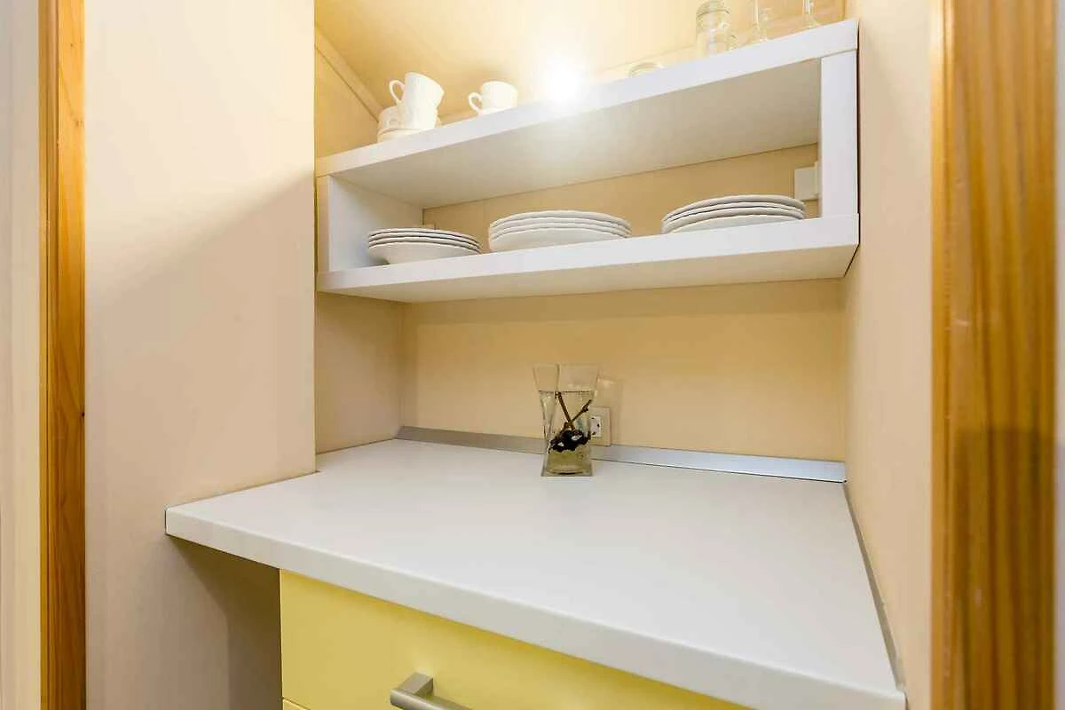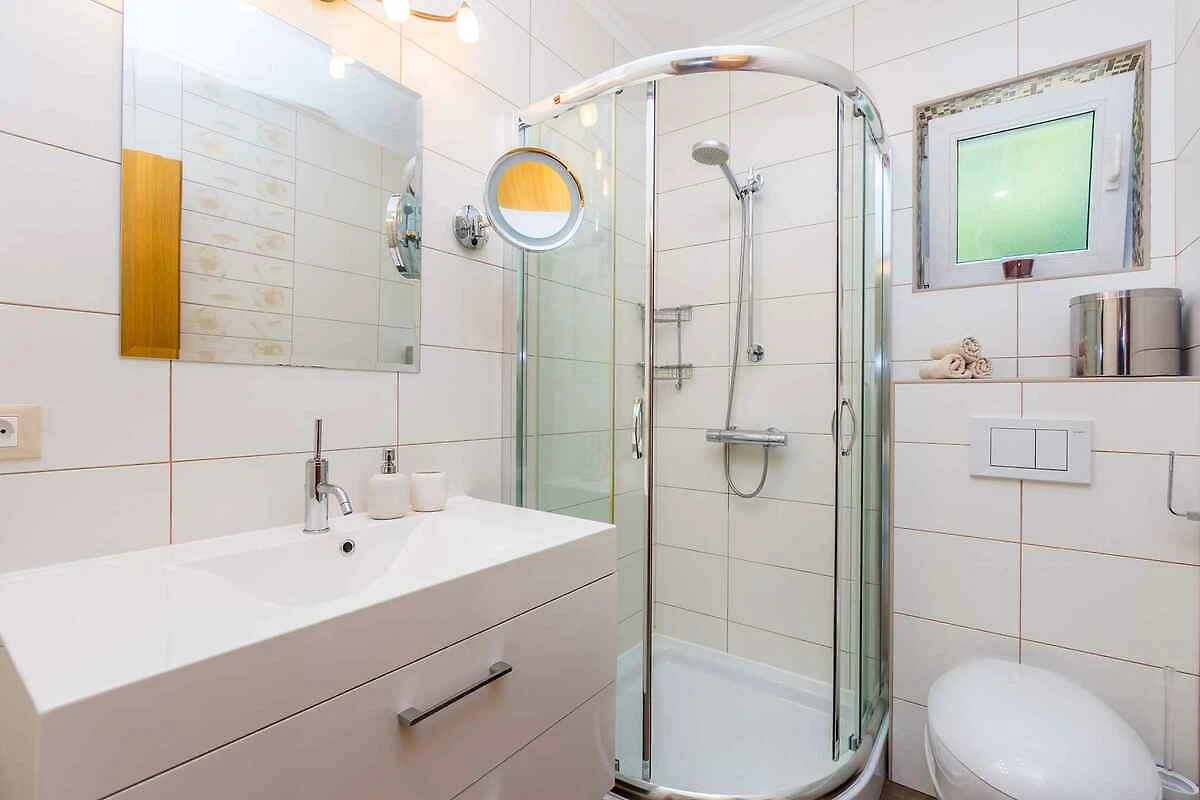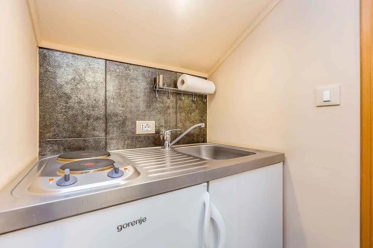 1° piano: Soggiorno/camera da letto con 2 letti aggiuntivi su divano/sofa. Cucina in soggiorno/camera da letto con zona pranzo, fornello elettrico (piano cottura ceran), forno, cappa aspirante, lavastoviglie, frigorifero (scomparto del ghiaccio), microonde, caffettiera e bollitore elettrico. Bagno con doccia, 1 lavandino, WC, asciugacapelli e finestra.