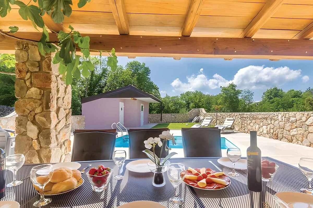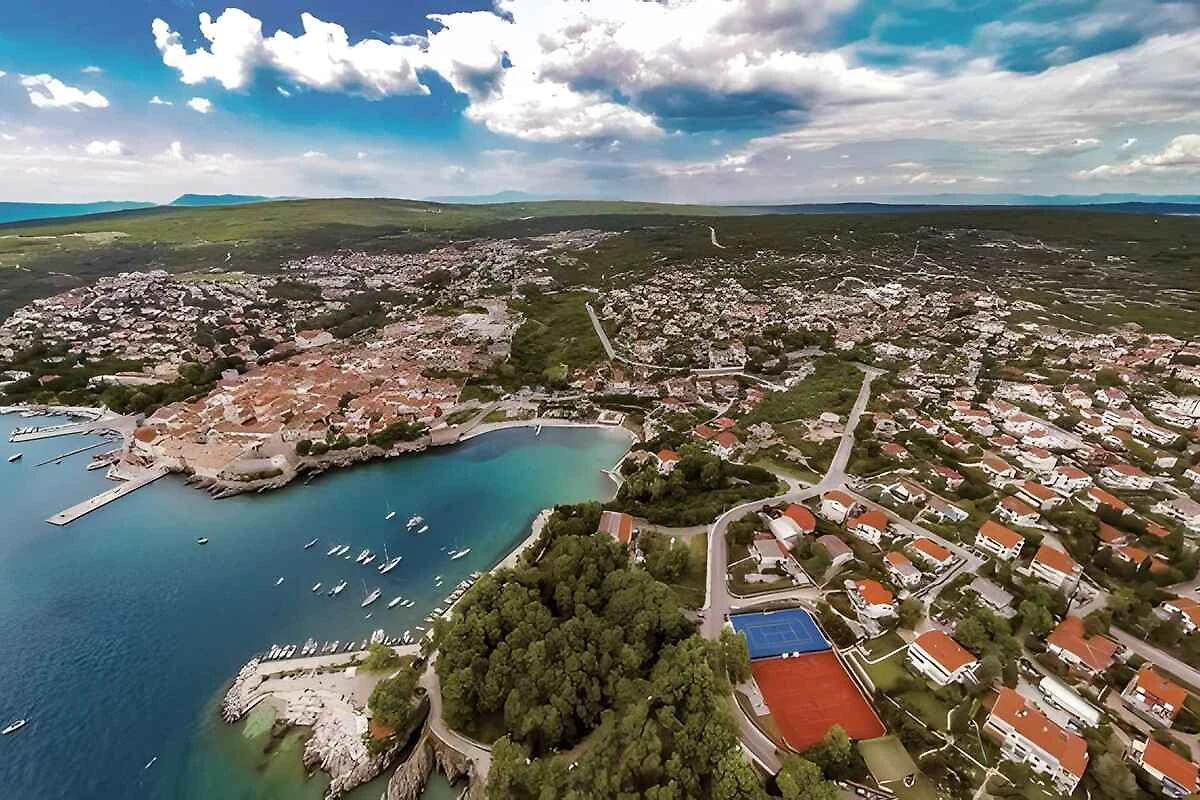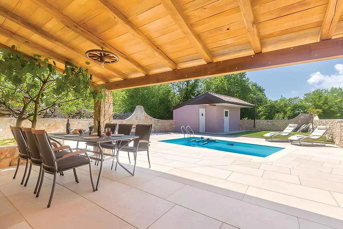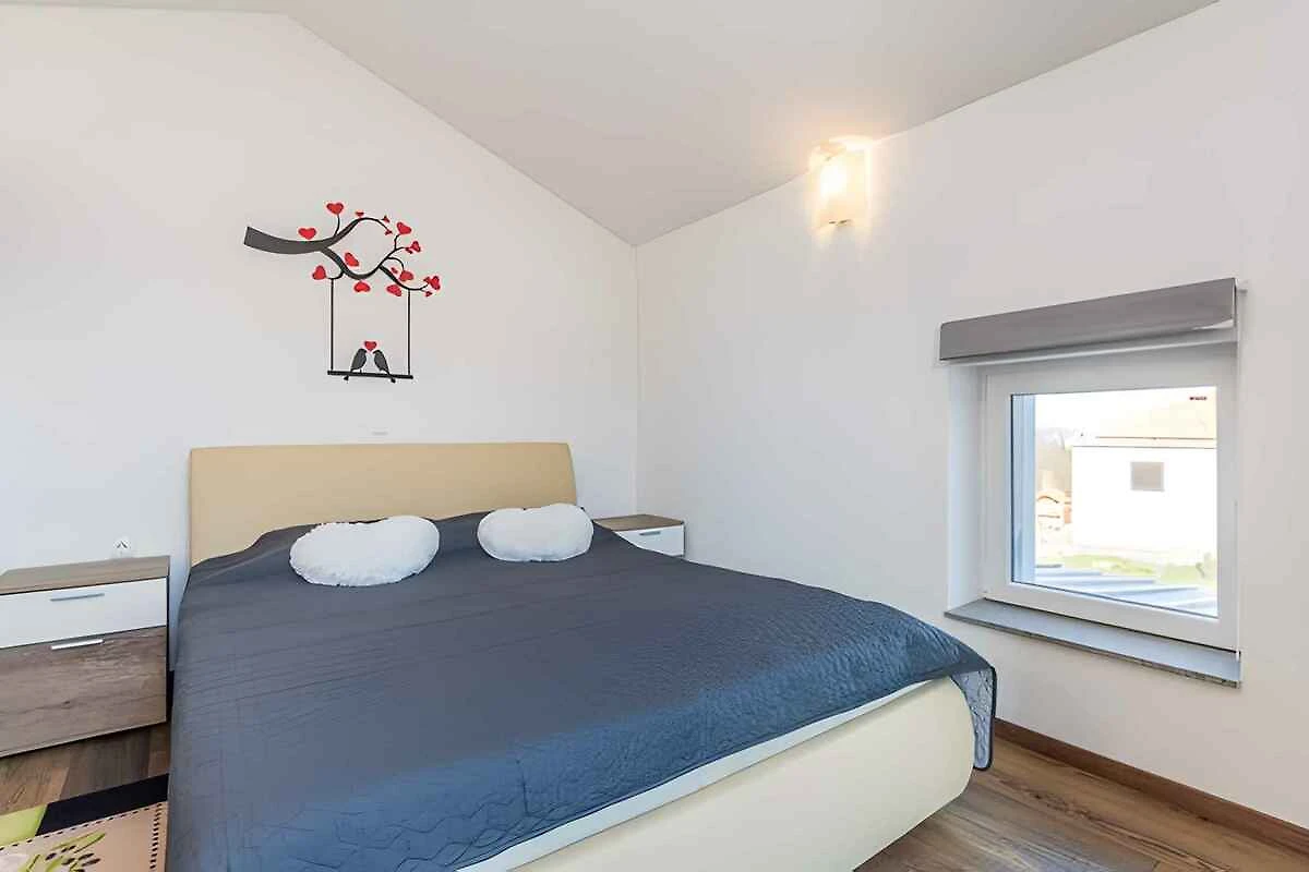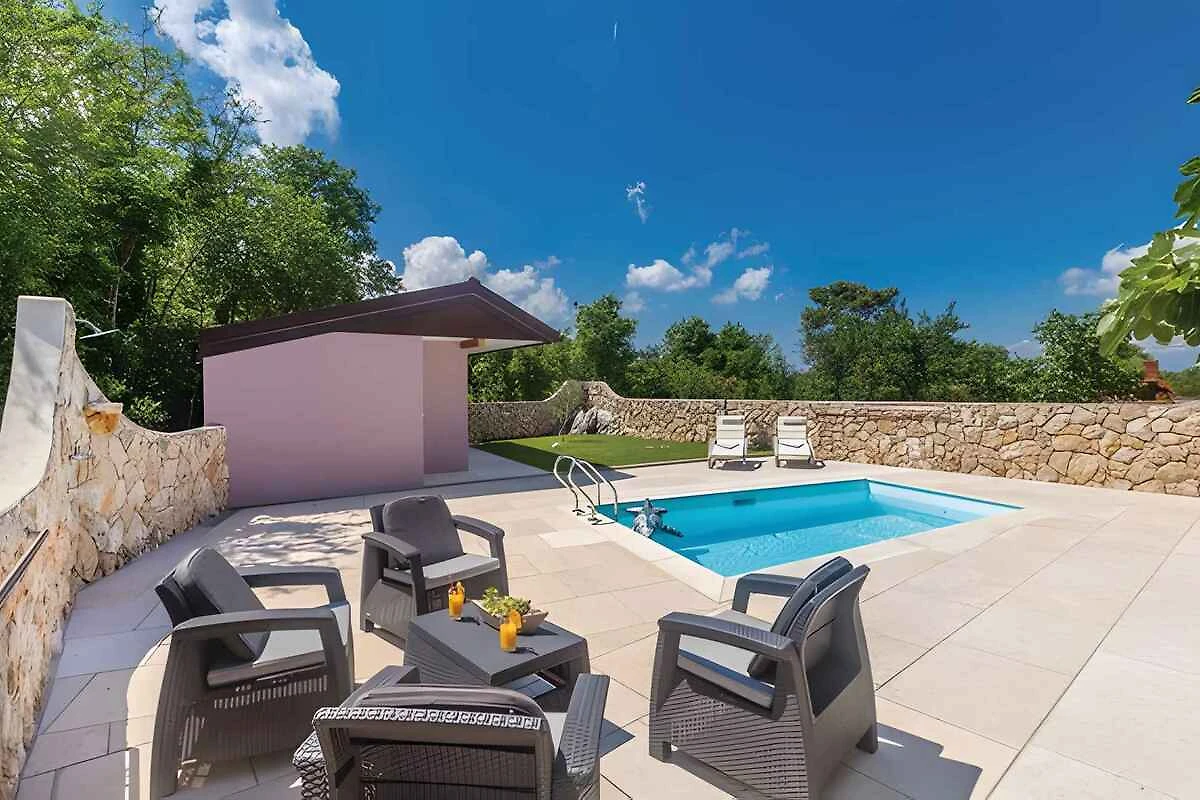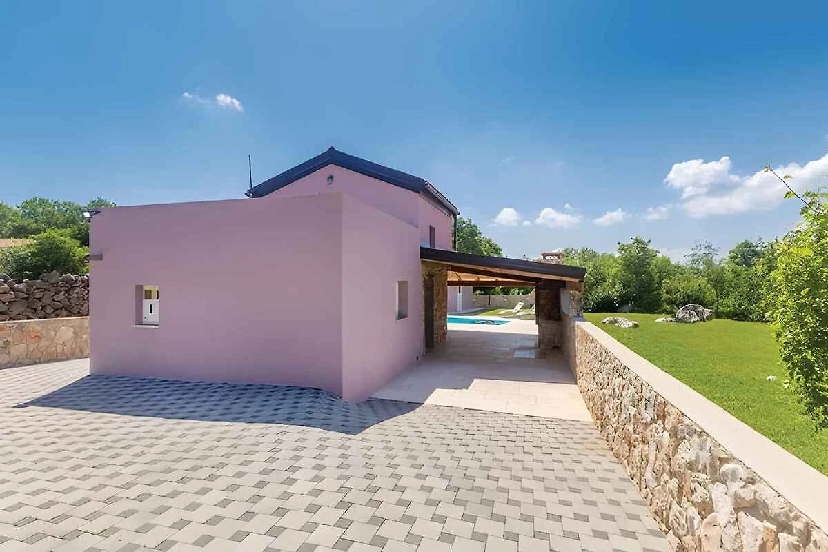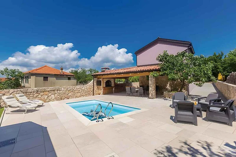 Sveti Vid Dobrinjski, frazione Dobrinj. La villa si trova in una trama del giardino chiuso, grande 500 mq con prato, fiori, arbusti e alberi, delimitata da una recinzione e una siepe. Il proprietario non abita nella casa o nella proprietá. Sulla proprietà c'è una bella cucina estiva con una grande griglia. L'accesso avviene attraverso una strada (asfaltata). Parcheggio sulla proprietà.