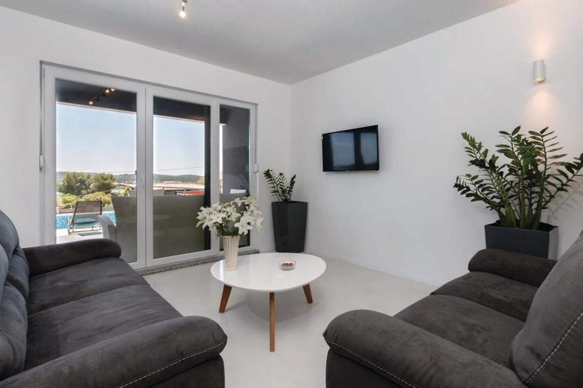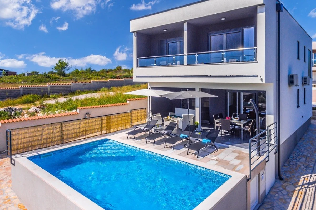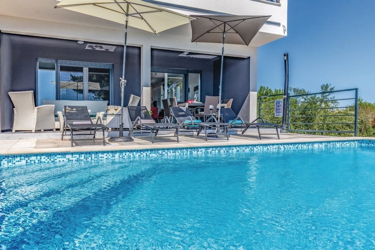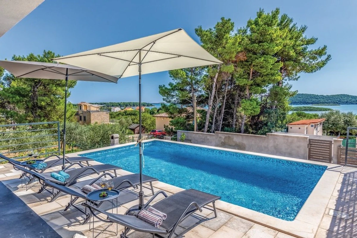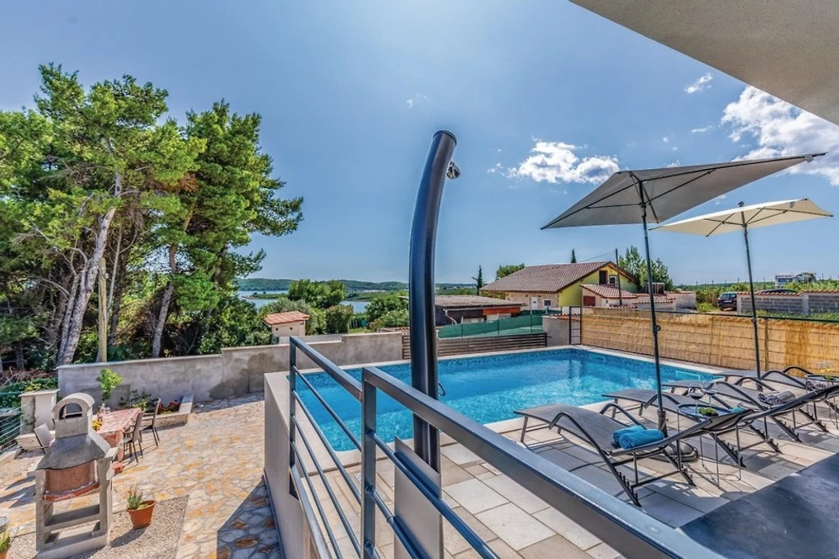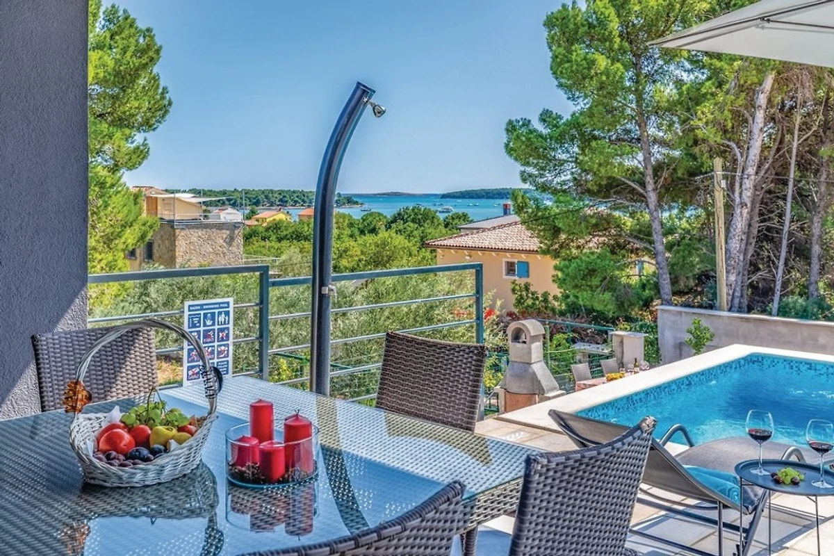 Villa Pura Vida a Pomer è una bellissima casa vacanze moderna con piscina e vista mare. La villa si trova in una parte tranquilla di Pomer e offre una vacanza rilassante.