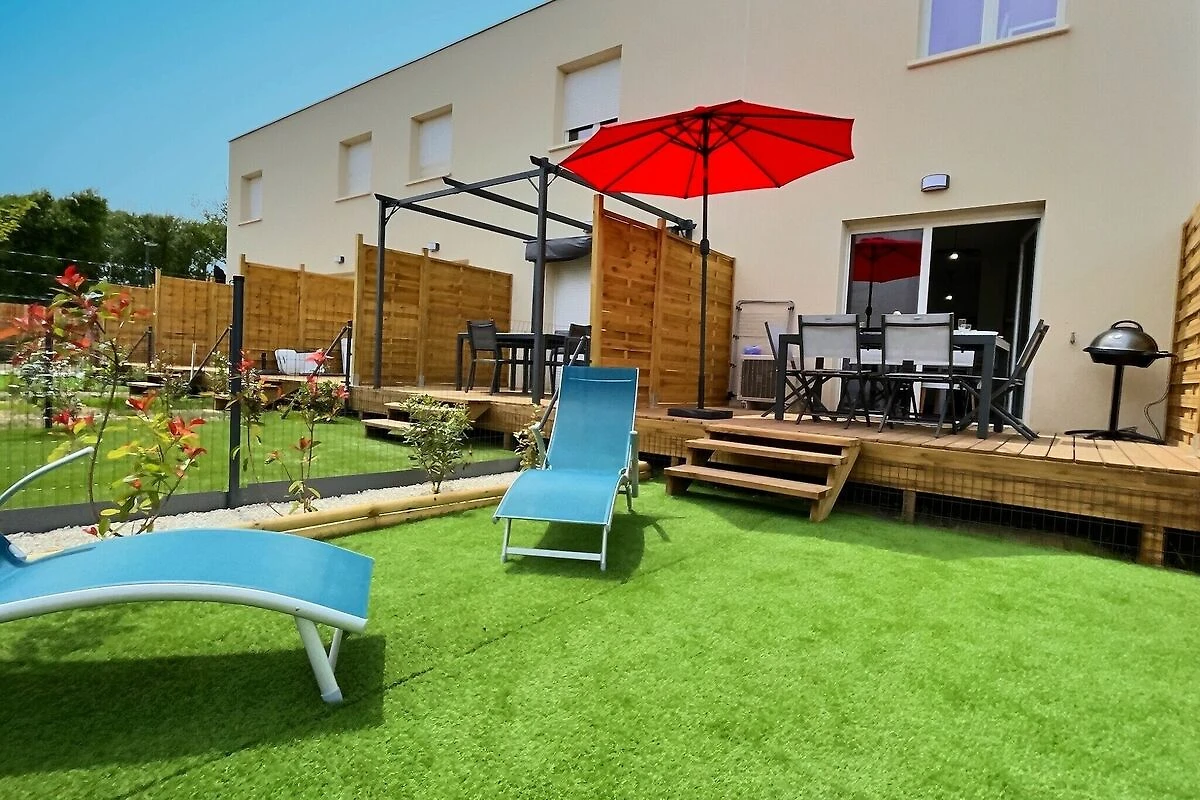 La maisonette ha un balcone o un terrazzo/giardino con sedie. I giardini hanno erba artificiale, piante e recinzioni in legno che garantiscono la privacy.