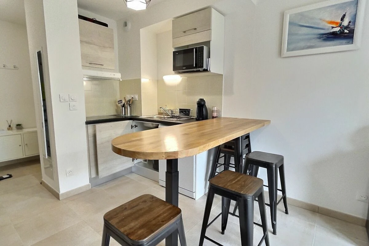 La zona cucina completamente attrezzata comprende una lavastoviglie e una macchina da caffè elettrica.