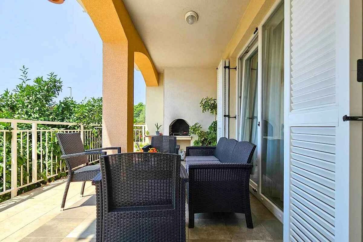 Novigrad, frazione Šaini. L' appartamento vacanze si trova in una trama del giardino chiuso con prato e fiori, delimitata da una recinzione e una siepe. Il proprietario non abita nella casa o nella proprietá. L'accesso avviene vicino a una strada secondaria (asfaltata). Parcheggio (per 1 auto) sulla proprietà.