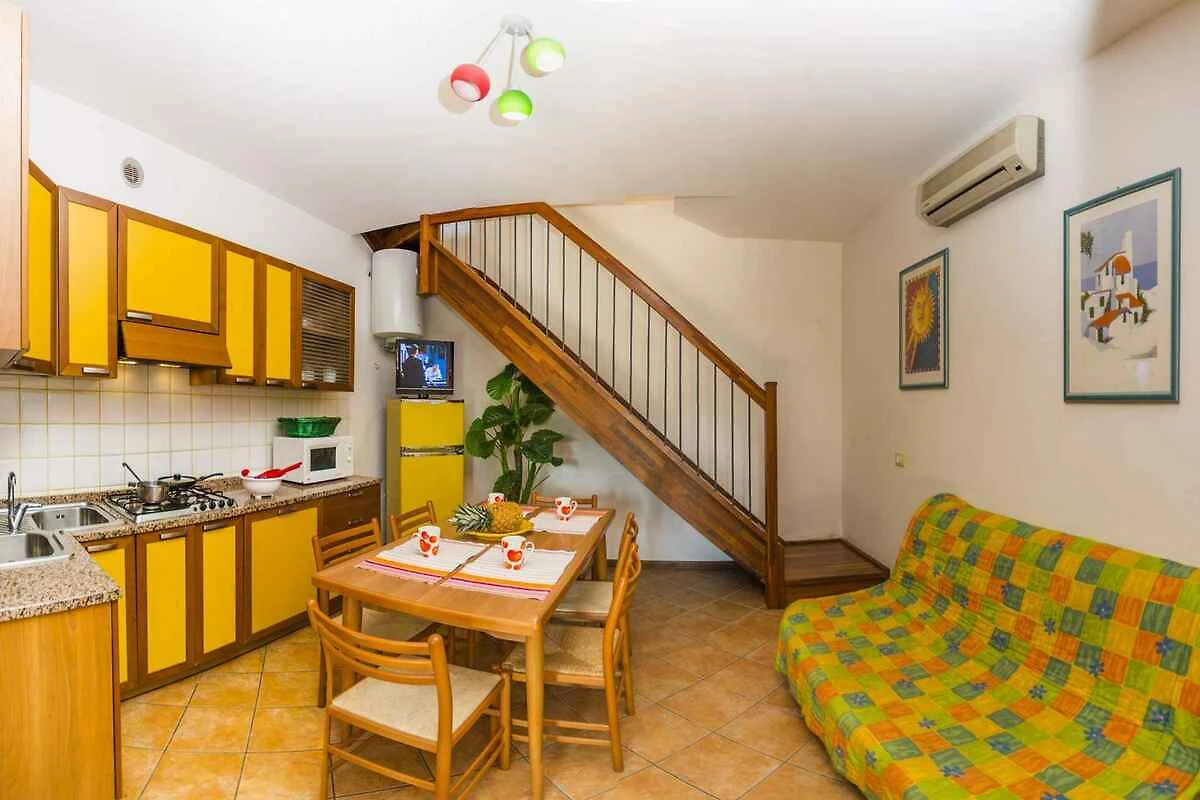 Piano terra: Cucina soggiorno con 1 letto aggiuntivo su divano letto doppio, TV, zona pranzo e accesso alla terrazza. La cucinetta nella cucina soggiorno (15 mq) con stufa a gas, frigorifero (160 l), microonde e accesso alla terrazza.