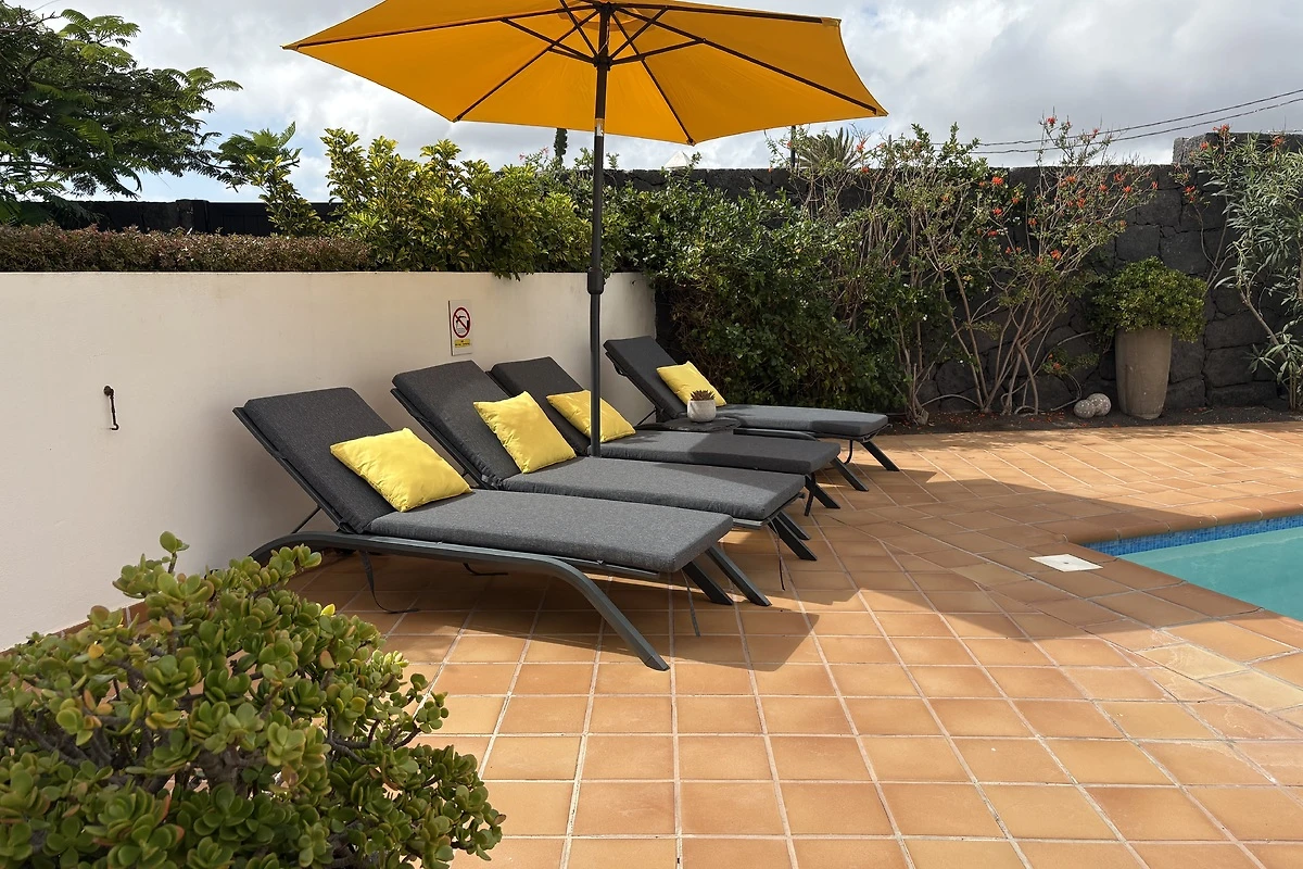 Da una delle camere da letto al piano terra si accede direttamente all'area della piscina tramite una porta finestra. Qui potrete nuotare indisturbati e godervi il sole di Lanzarote sui lettini. Quest'area è protetta dal vento e quasi nascosta alla vista. Inoltre, invita a soffermarsi grazie alle piante e ai comodi mobili da terrazza.