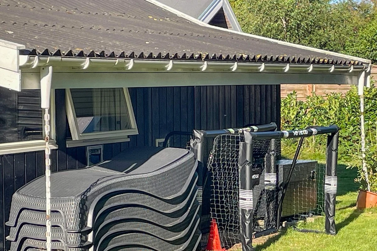 Dalla zona piscina si accede a una terrazza parzialmente schermata esposta a sud, dove è possibile rilassarsi con i mobili da giardino. Nel giardino di 1000 m² troverete anche una porta da calcio. Il giardino è arredato con diverse terrazze in legno.