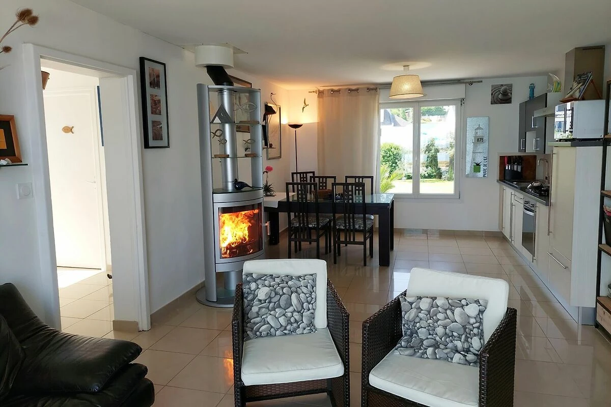 Il mare a perdita d'occhio. Proprio di fronte alla litoranea, una fantastica spiaggia di sabbia e il mare. Arredato con gusto con i migliori comfort. Per prima cosa al mattino, mentre si fa colazione in terrazza, si può godere del meraviglioso panorama e dell'aria ricca di iodio. Anche chi ozia a letto può godere della splendida vista, perché i plantari sono stati appositamente rialzati per questo scopo. Il binocolo è disponibile per l'osservazione. Nella zona giorno, un caminetto rotante offre un piacevole comfort anche in bassa stagione. Dalla seconda camera, che si trova a livello del giardino, si accede direttamente all'ampio terrazzo esposto a sud dietro la casa. Nota: l'altezza del soffitto in questa stanza e il livello del giardino sono solo circa 1,75 m Il mare e il sentiero costiero, che si estende per oltre 18 km intorno a Plouguerneau, è alle porte. Con la bassa marea puoi attraversare la sabbia fino al porto turistico di fronte nelle distese fangose e cercare conchiglie. Nel piccolo paese ci sono molte creperie e ristoranti di pesce. Kayak e tavole da surf possono anche essere noleggiati a ore dalla scuola di vela locale, proprio di fronte al porto turistico. Il faro sull'omonima Ile Vierge è un simbolo del Pays des Abers e, con i suoi quasi 83 m, è il faro di pietra più alto d'Europa. Gite in barca con visite turistiche sono offerte dal porto turistico di Aber Wrach.