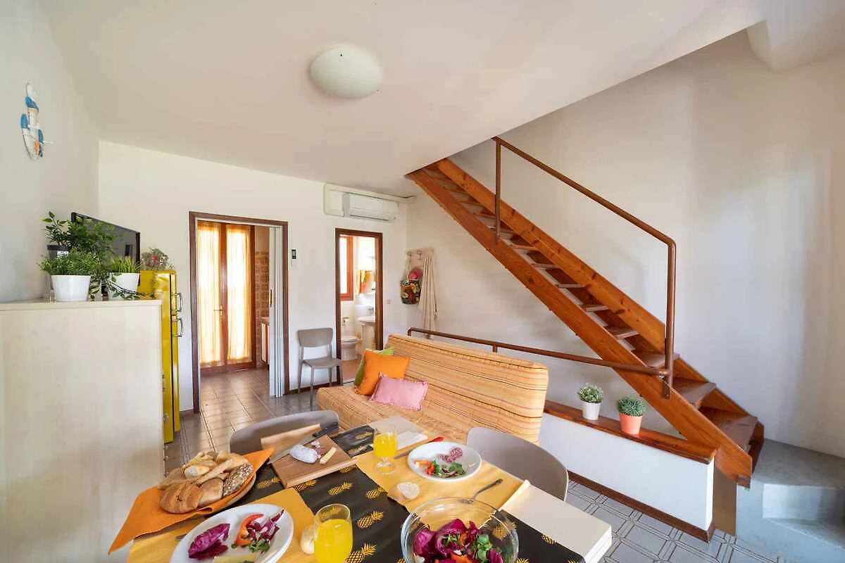 Piano terra: Soggiorno/camera da letto con 2 letti aggiuntivi su divano/sofa, TV e accesso alla terrazza. La cucinetta in soggiorno/camera da letto con microonde, caffettiera e accesso al balcone. Bagno con doccia, 1 lavandino e WC.