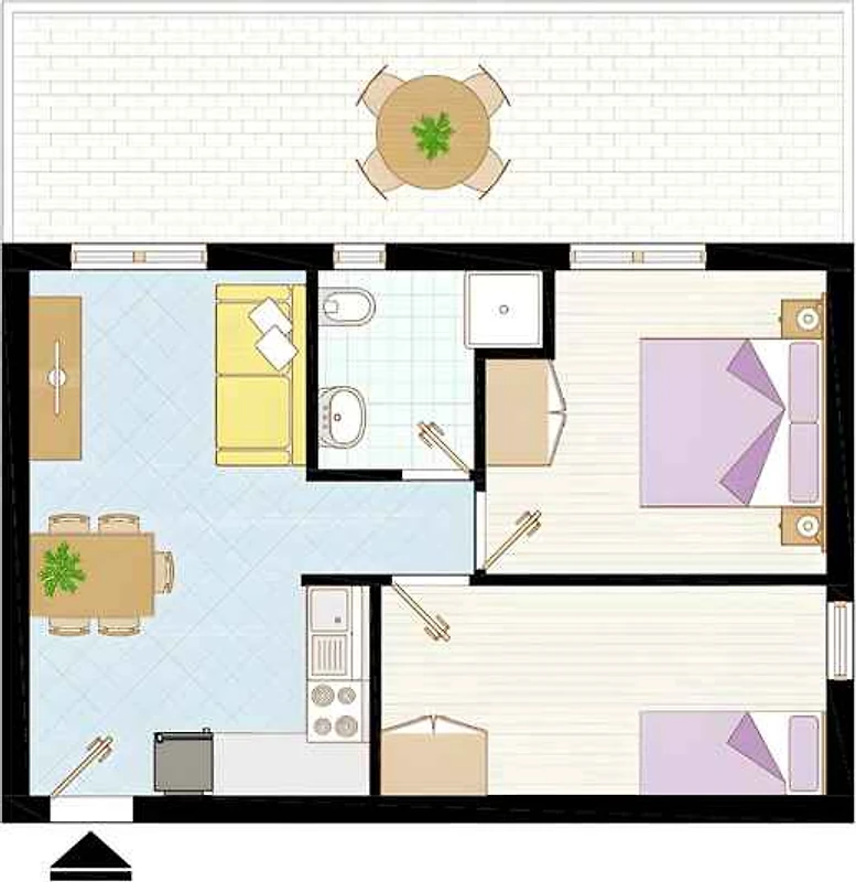 Appartamento vacanze, 1 piano, 3 stanze (di cui 2 camera da letto), 45 mq, totale 6 letti (di cui 2 letti aggiuntivi).