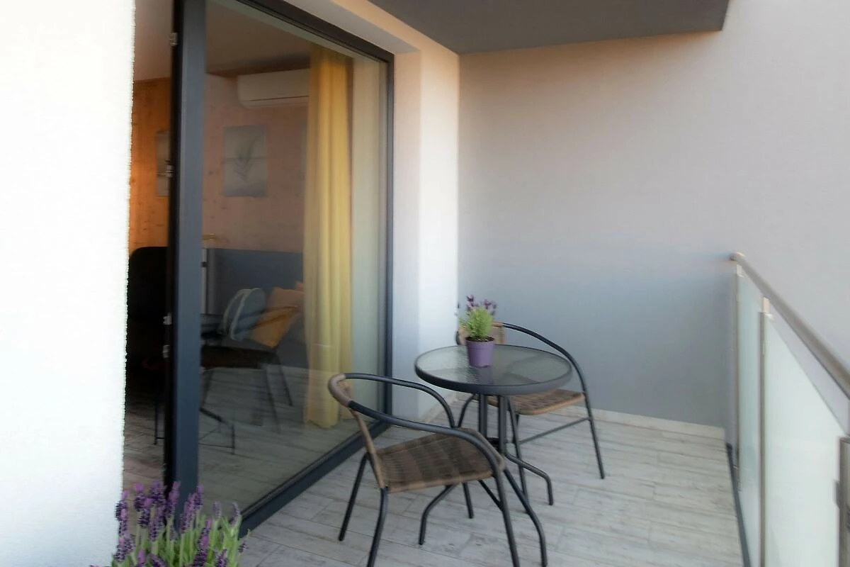 Accogliente appartamento con balcone. È una grande stanza che funge sia da soggiorno che da camera da letto. C'è un tavolo, TV, 2 letti singoli e un divano letto matrimoniale. La cucina è collegata alla camera. Bagno con doccia. L'appartamento è dotato di aria condizionata con funzioni di raffreddamento e riscaldamento.