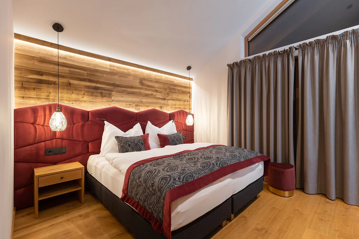 Al piano superiore vi aspettano tre luminose camere da letto con letti matrimoniali di alta qualità e bagno privato con doccia e WC – per un sonno ristoratore e un inizio di giornata da sogno con vista sulle montagne.