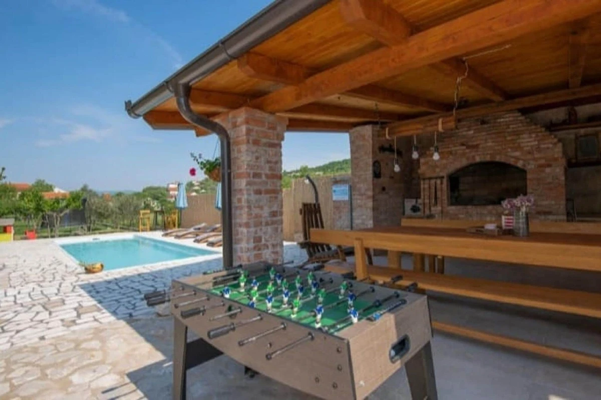 cucina esterna, lettino con sponde, doccia(all'esterno), patio, riscaldamento, aria condizionata, terrazza(privato), giardino(privato, recintato), mobili da giardino, lettini prendisole, barbecue, parcheggio, tappeto elastico, ombrellone, piscina(privato, aperta da 1/2 Mag fino a Set compreso), giochi per bambini, biliardino, seggiolone, asse da stiro, ferro da stiro, asciugacapelli