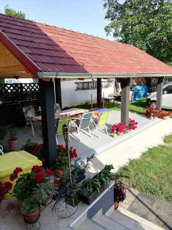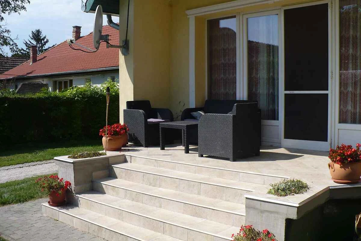 Balatonberény. La casa vacanza si trova in una trama del giardino chiuso, grande 400 mq con prato e alberi, delimitata da una recinzione. Il padrone di casa vive in un altro edificio nella stessa proprietá. Parcheggio sulla proprietà.