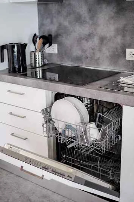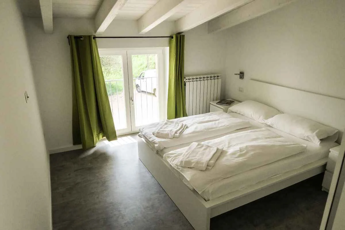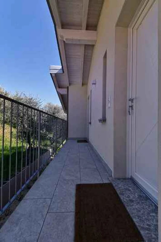 e conduce sopra una scala esterna, il balcone 16 mq grande direttamente nel corridoio con porte di tutte le camere. Soggiorno (25 mq, camera di passaggio) con 2 letti aggiuntivi su divano letto doppio, TV e accesso alla terrazza (16 mq, mobili da giardino, 1 tavolo, 4 sedie). Angolo cucina nel soggiorno (camera di passaggio) con TV, zona pranzo (4 posti), fornello elettrico (piano cottura ceran, 4 fornelli), lavastoviglie, frigorifero (scomparto del ghiaccio), microonde, caffettiera, tostapane, bollitore elettrico e accesso al balcone. Bagno (7 mq) con doccia, WC, bidet, asciugacapelli e finestra. Camera da letto con 1 letto matrimoniale.