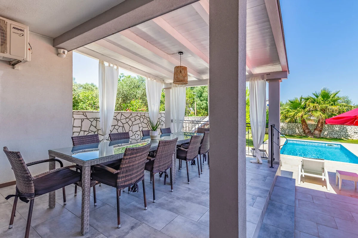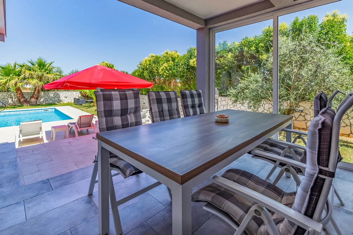 Abbiamo trascorso una bellissima vacanza con il cane nella villa ben attrezzata con bella piscina e proprietà completamente recintata. La posizione è molto tranquilla, su una strada di passaggio. Tutte le camere da letto con bagno privato come descritto, sulla terrazza un grande tavolo da pranzo e un'accogliente area lounge.