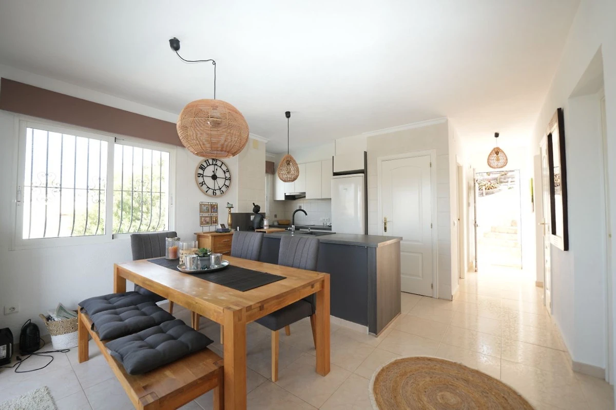 Questa villa, praticamente nuova e al contempo ben tenuta, è stata costruita con una struttura solida a doppia parete. L'atmosfera luminosa e accogliente vi colpirà. Godetevi la vista meravigliosamente estesa sul mare e sul panorama montuoso circostante. La villa si sviluppa su 2 piani. Il livello principale della casa è composto da 1 soggiorno con sala da pranzo, 1 bagno con vasca, una terrazza coperta, oltre a una grande terrazza scoperta con vista panoramica. Il seminterrato convertito non viene affittato. La piscina adiacente alla casa misura 8 x 4 metri. Inoltre, ci sono ulteriori aree per sedersi protette dal sole, una cucina esterna e una doccia. Dotazione