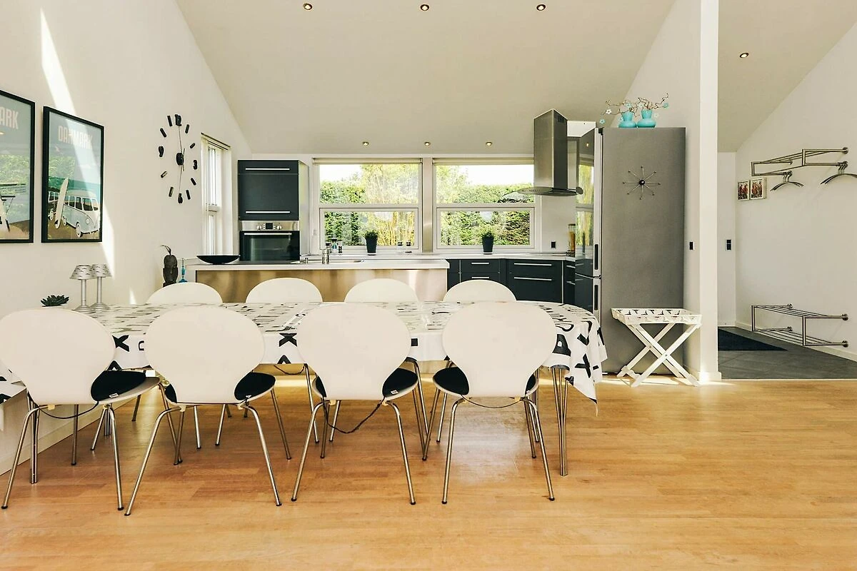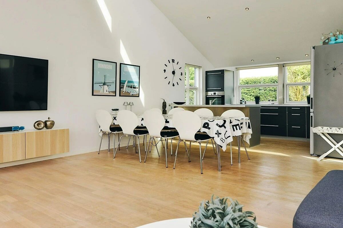 Situata non lontano da una meravigliosa spiaggia sabbiosa, questa graziosa casa vacanze combina comfort moderni con un'atmosfera luminosa e ariosa. La casa è progettata con soffitti alti e ampie finestre che lasciano entrare molta luce naturale e creano un ambiente spazioso e accogliente. Dall'ingresso si accede direttamente all'ampia zona giorno open space, che costituisce il cuore della casa. Qui troverete un'accogliente zona soggiorno, una zona pranzo e una cucina moderna e ben attrezzata, dotata di colori contemporanei ed elettrodomestici di qualità. In piedi in cucina e guardando verso l'alto, la luce naturale filtra dalle alte finestre, rendendo la stanza aperta e luminosa senza mai risultare limitata.