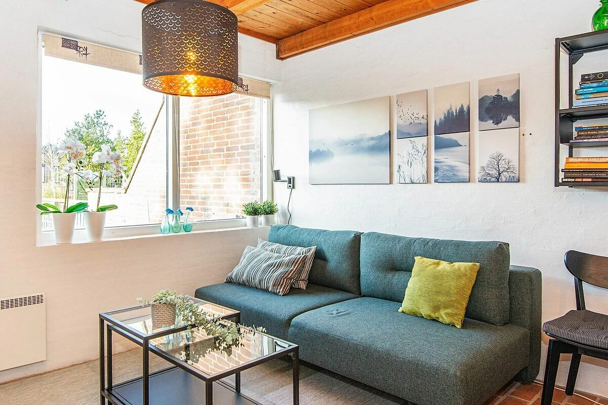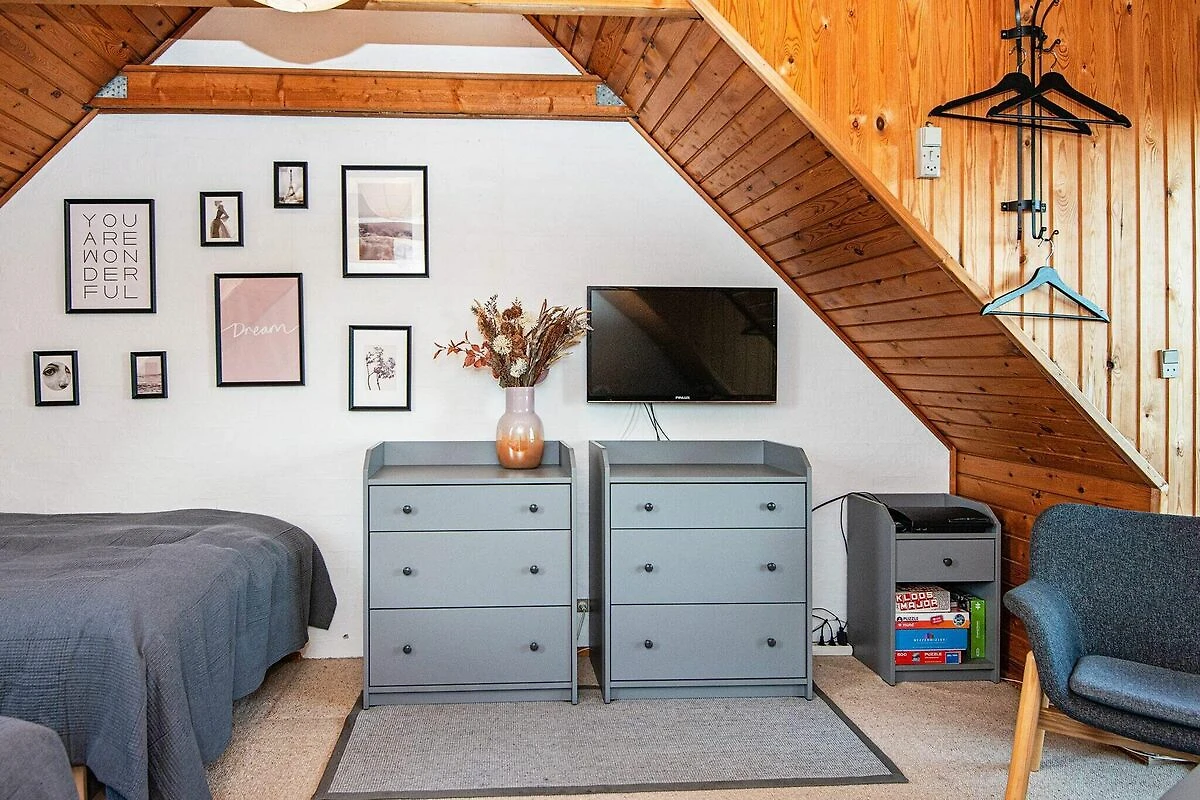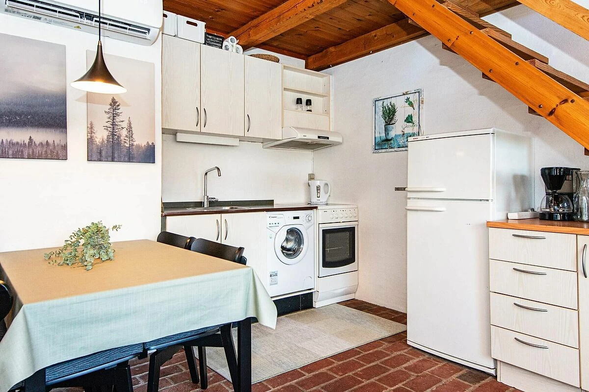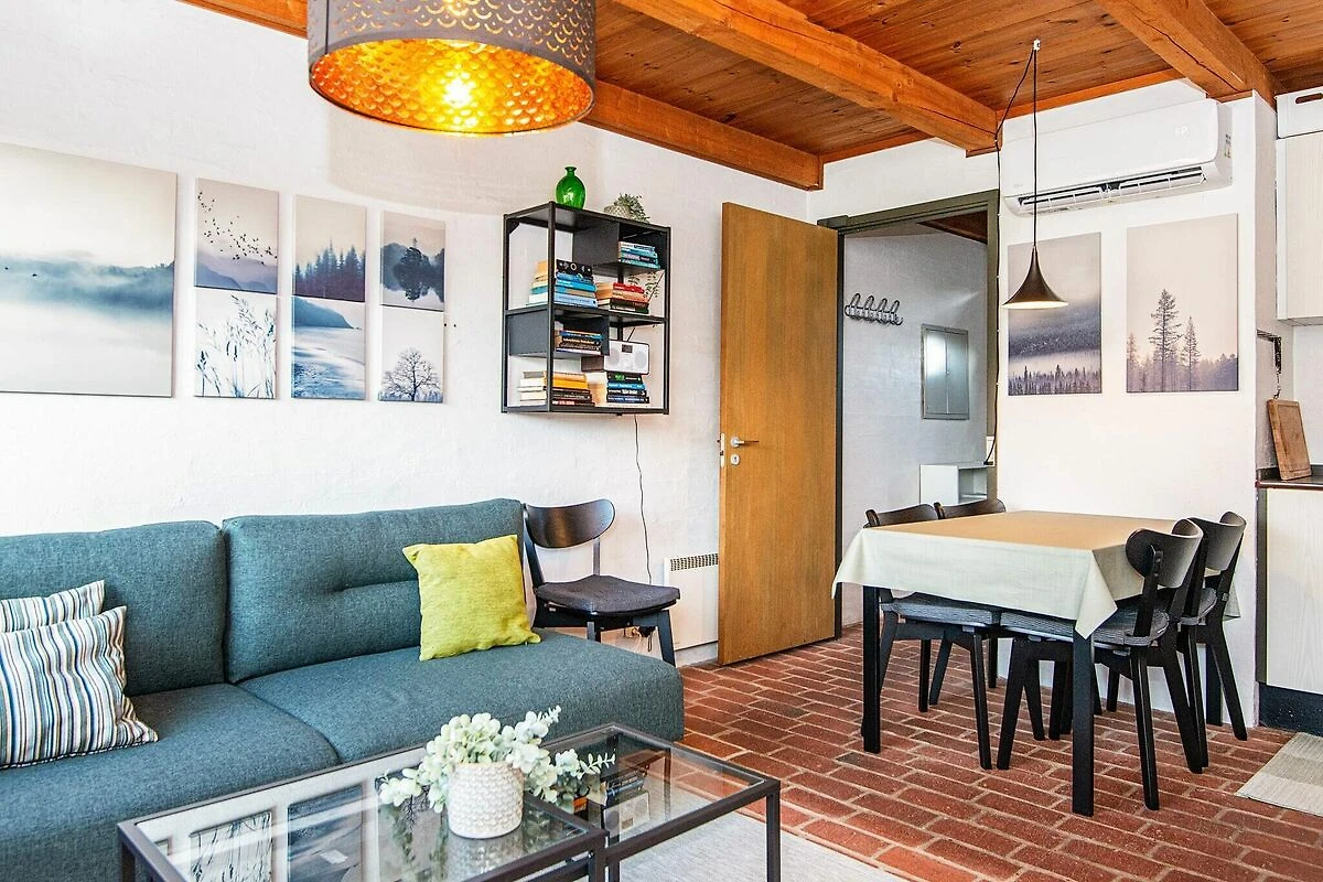, Soggiorno(brandina doppia), Cucina separata(mobile cucina(elettrico), caffettiera, frigorifero, congelatore(1-59L), lavatrice), Soggiorno/camera da letto(brandina doppia, TV(canali televisivi tedeschi, canali TV danesi), chromecast), Camera da letto(2x letto singolo), Bagno(lavabo, doccia, WC), riscaldamento(elettrico), terrazza, mobili da giardino, termopompa aria-aria
