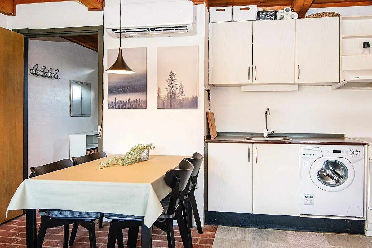 Al piano terra, attraverso un piccolo corridoio, si accede a una cucina pratica e funzionale, collegata al soggiorno. Qui troverete anche un divano letto che può essere convertito in due posti letto. Il bagno al piano terra è dotato di doccia e riscaldamento a pavimento, per un comfort extra nelle giornate più fresche.