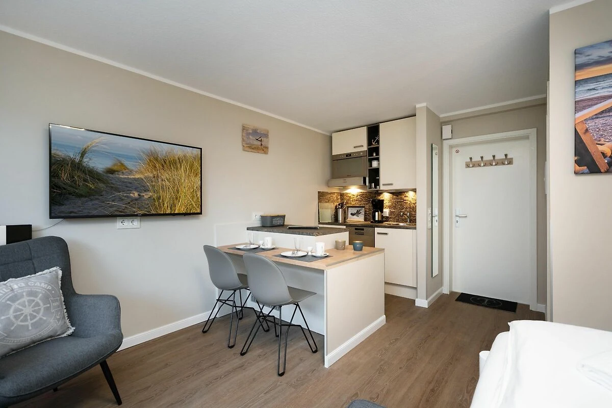Kleines 1-Zimmer-Appartment für eine Einzel-Person oder Paar, das den ganzen Tag unterwegs ist. Ruhige Lage am Rande von Westerland. Der Vermieter ist sehr freundlich und hilfsbereit. Gegenüber ist eine Bäckerei.