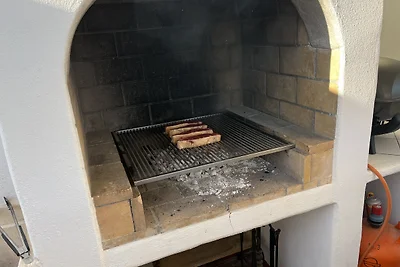 Dalla cucina-soggiorno si accede alla terrazza superiore coperta con cucina esterna. La grande griglia a carbone invita a un accogliente barbecue. Sono disponibili un grande tavolo con 6 sedie e comodi mobili da salotto.