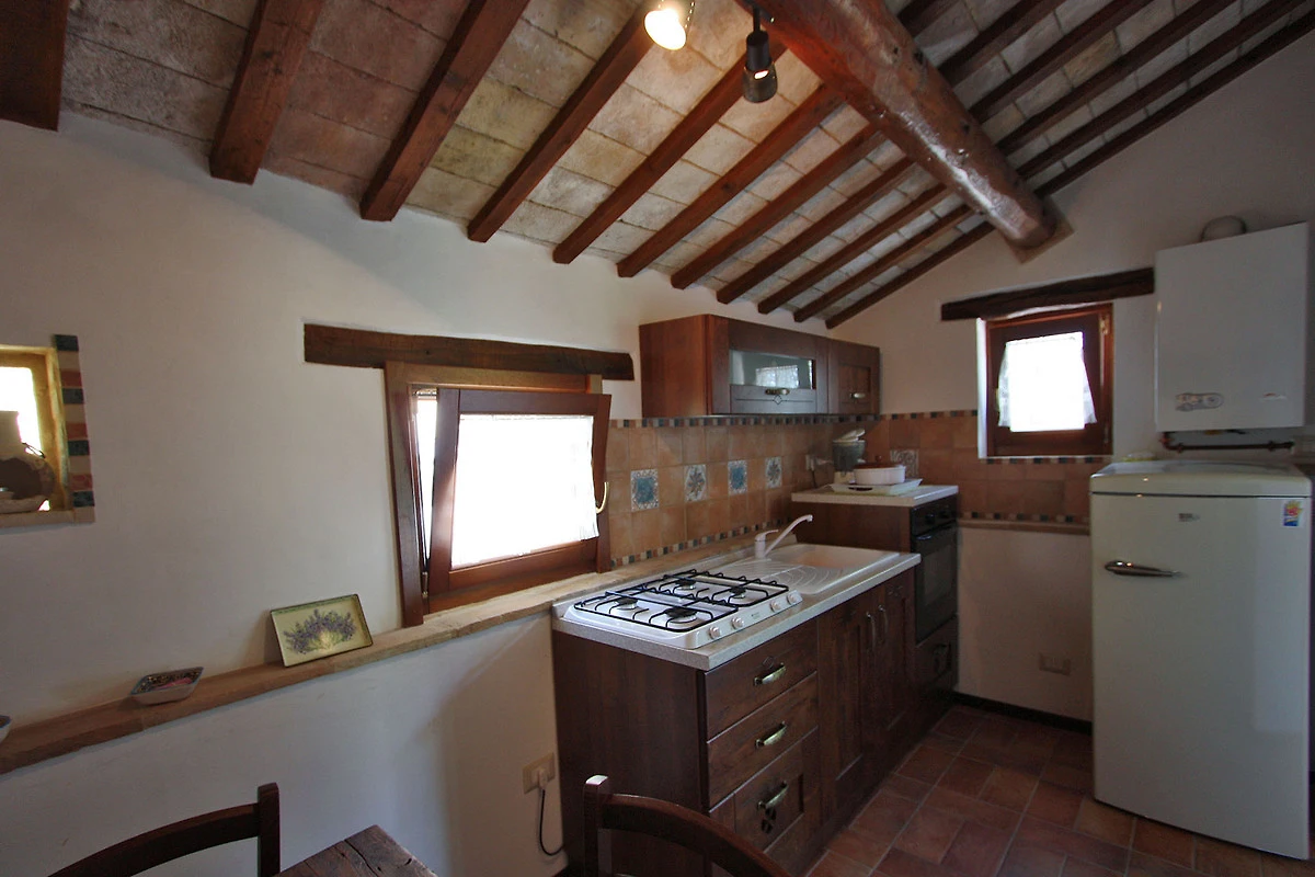La proprietà è composta da un open space in cui si trova soggiorno, cucina e camera matrimoniale con bagno con doccia. Dalla camera matrimoniale tre scalini conducono ad una camera doppia, con uscita sul piccolo porticato.