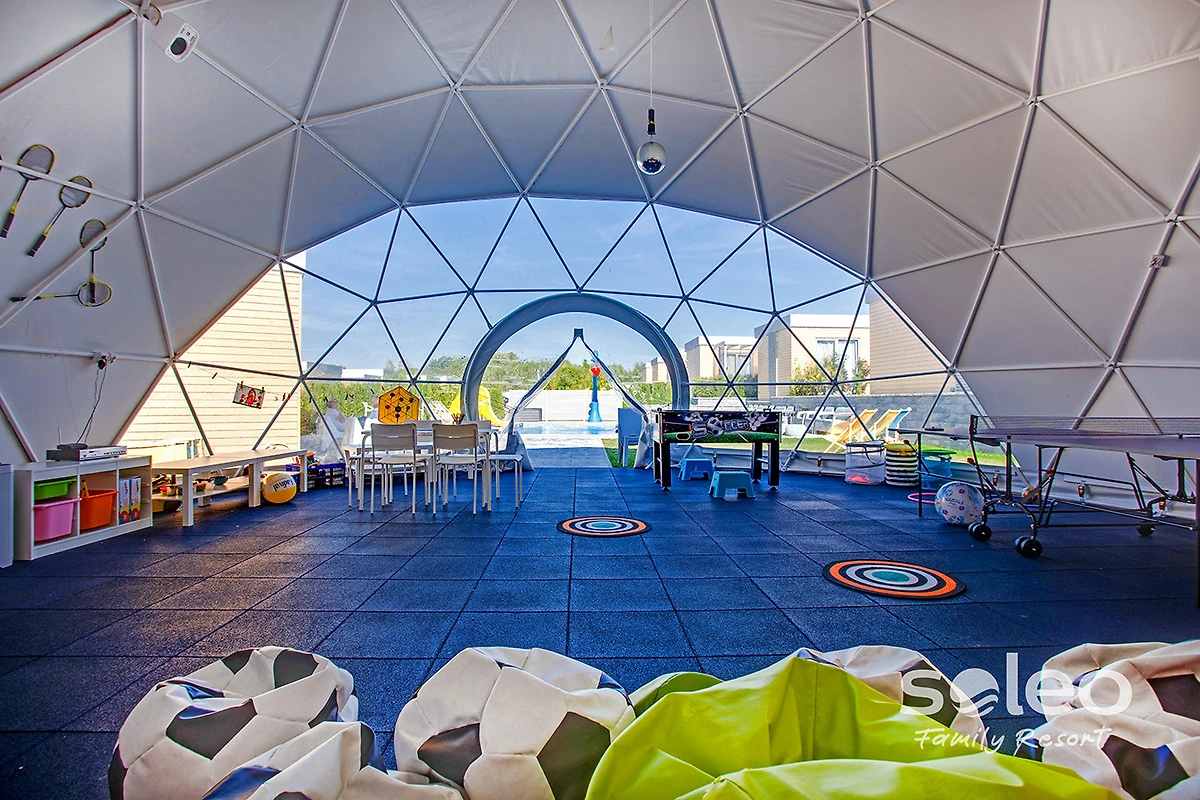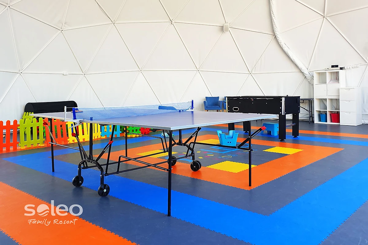 • 3 sale giochi coperte attrezzate con giocattoli attraenti, calcio balilla, tavolo da ping pong, angoli creativi