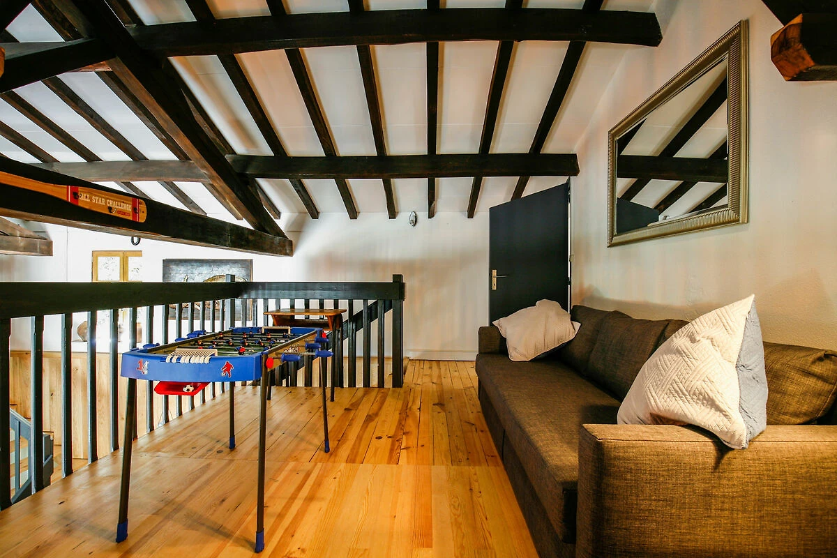 Al 1° piano: (Camera da letto(20 m2)(2x divano letto singolo, letto king size matrimoniale(180 x 200 cm), TV, balcone o terrazza), Camera da letto(12 m2)(letto a castello o 2 letti singoli), Camera da letto(raggiungibile attraverso camera da letto intercomunicante, 12 m2)(letto matrimoniale(160 x 200 cm), balcone o terrazza), Camera da letto(9 m2)(2x letto singolo), Bagno(in comune con altri ospiti)(doccia massaggio, lavandino, WC), Soppalco aperto(2x divano letto doppio, TV, salottino, biliardino, giochi da tavolo, giocattoli))