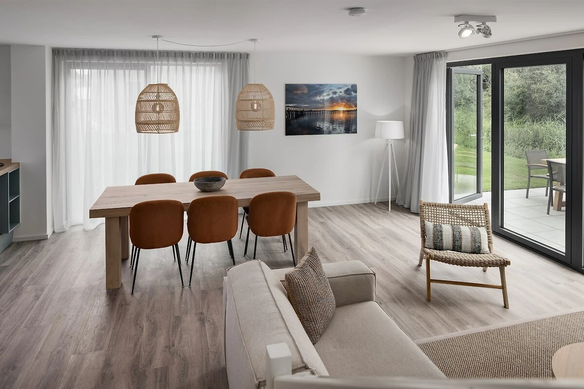 Questa villa per 6 persone dispone di un ampio soggiorno con TV e di una lussuosa cucina a pianta aperta attrezzata con forno a microonde e lavastoviglie. Nota bene: questa villa non dispone di un'isola cucina. Al piano terra si trovano tre camere da letto, una delle quali include un bagno privato con cabina doccia. Un WC separato è disponibile nel corridoio. Un ripostiglio ospita una lavatrice e un'asciugatrice, ma questi elettrodomestici non sono inclusi nella dotazione standard.