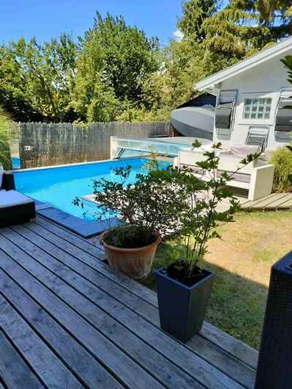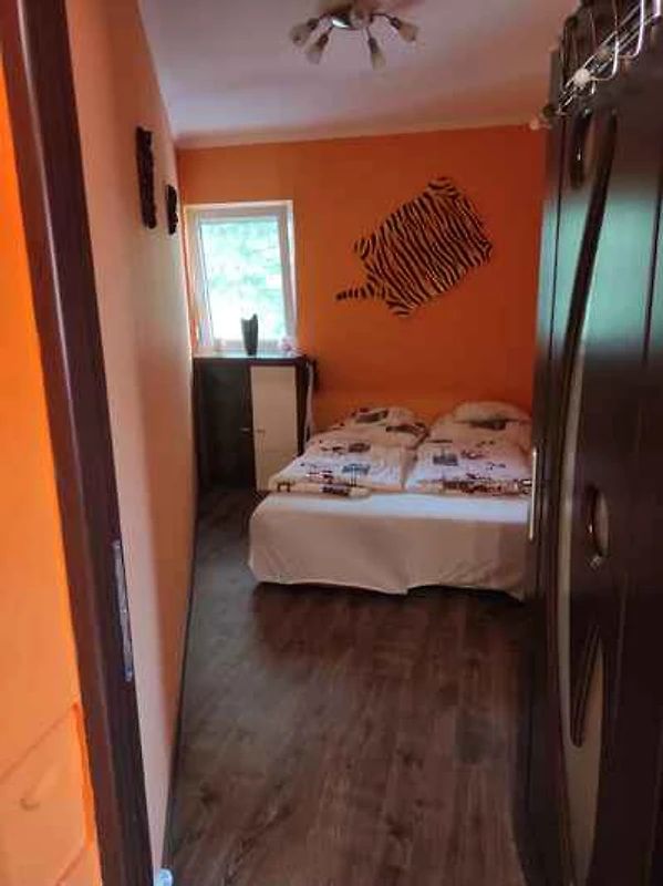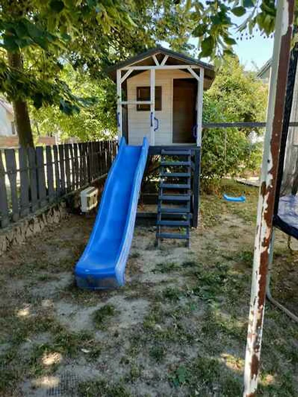 Siofok. L' appartamento vacanze si trova in una trama del giardino chiuso, grande 600 mq con prato e alberi, delimitata da una recinzione. Il proprietario non abita nella casa o nella proprietá. L'accesso avviene vicino a una strada secondaria (asfaltata). Parcheggio (per 1 auto) sulla strada davanti alla casa.
