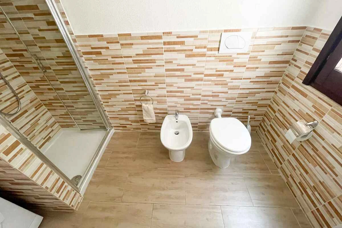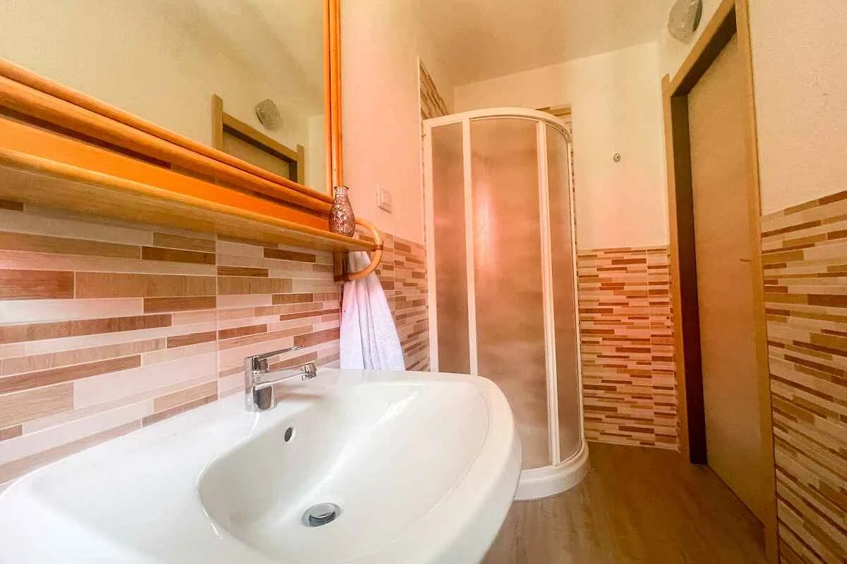 L'ingresso della vostra casa vacanze é a livello del suolo. Soggiorno con 2 letti aggiuntivi su divano letto doppio, angolo di seduta, TV, zona pranzo (8 posti) e accesso alla loggia (insieme a Sala ricreativa). 3 camere da letto tutto a con 1 letto matrimoniale. Cucina nella cucina soggiorno con zona pranzo, stufa a gas (4 fiamme), forno, cappa aspirante, frigorifero (scomparto del ghiaccio), microonde, caffettiera e accesso alla terrazza. Bagno con doccia, 1 lavandino, WC, bidet e finestra. Bagno con lavatrice, doccia, WC, bidet, asciugacapelli e finestra.