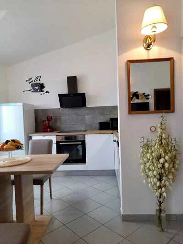e conduce tramite una scala interna direttamente nel soggiorno. Soggiorno (stanza di passaggio) con angolo salotto, TV, aria condizionata e accesso al balcone (mobili da giardino, 1 tavolo, 4 sedie, ombrellone). Camera da letto con 1 letto matrimoniale. Camera da letto con 1 letto matrimoniale. Cucina (stanza di passaggio) con TV, zona pranzo (4 posti), piano cottura a gas, piano cottura elettrico (piano a induzione, 4 fuochi), forno, cappa aspirante, lavastoviglie, frigorifero (scomparto freezer), microonde, macchina da caffè, tostapane, bollitore elettrico e accesso al balcone. Bagno con lavatrice, doccia, 1 lavabo, WC e finestra.
