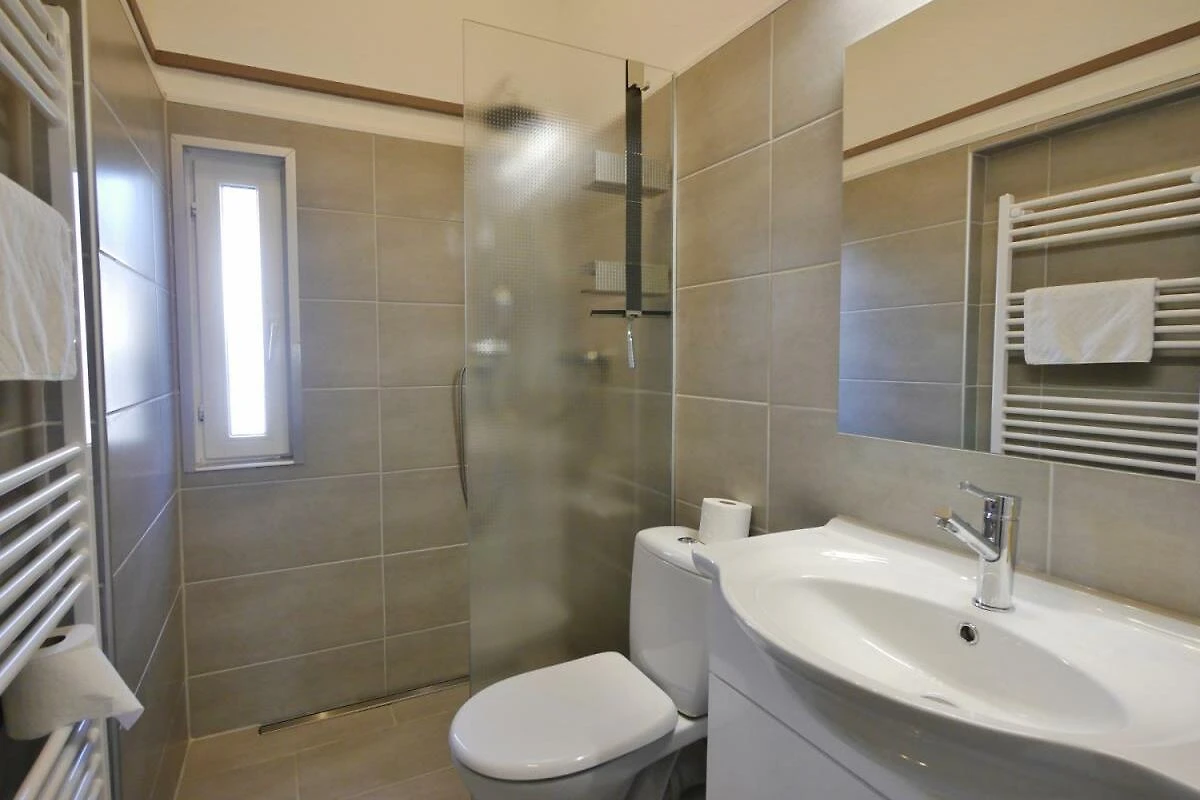 - moderno bagno con doccia con scaldasalviette, asciugacapelli, specchio per il trucco e finestra