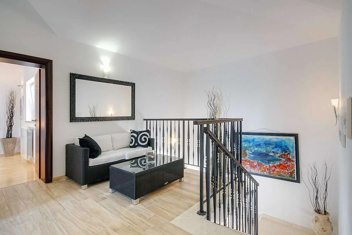 Al 1° piano: (Camera da letto(letto matrimoniale(160 x 200 cm)), Camera da letto(letto matrimoniale(160 x 200 cm)), Camera da letto(2x letto singolo(80 x 200 cm)), Bagno(vasca idromassaggio, doccia, lavandino, WC), pianerottolo(aria condizionata), spazio relax(sauna, 2x lettini prendisole), balcone)