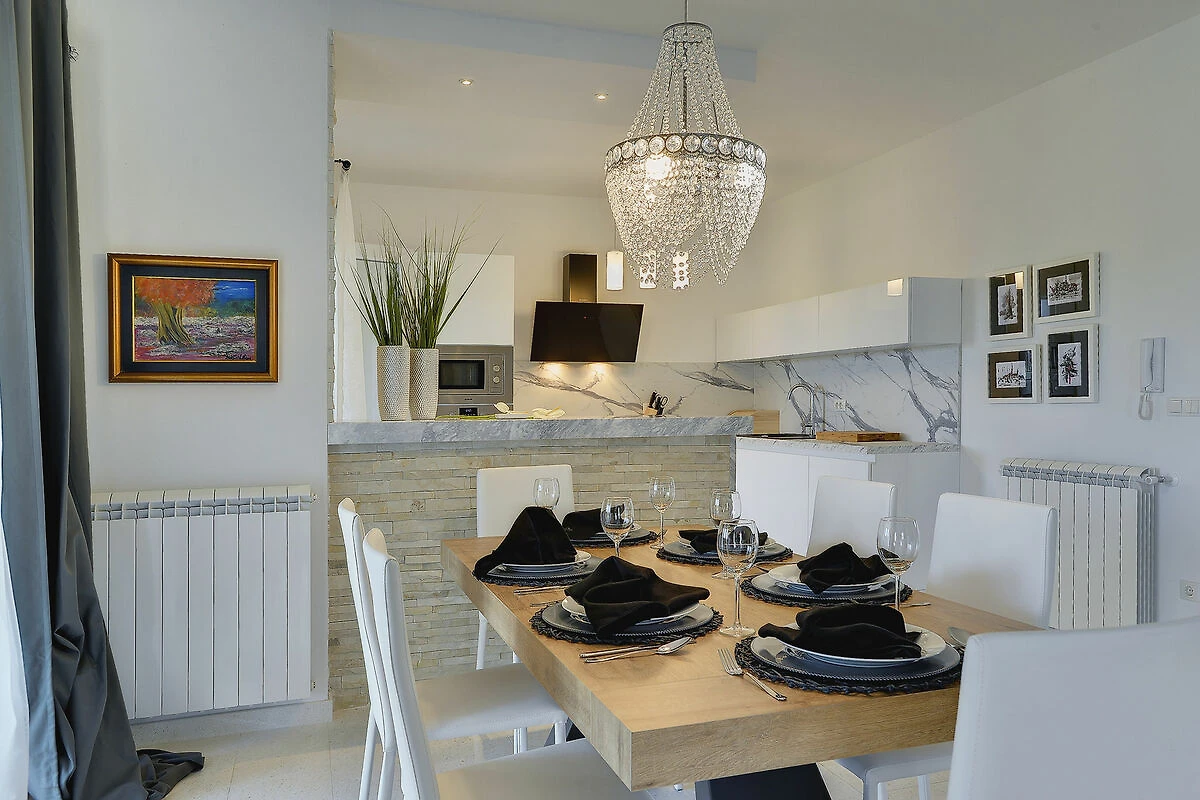 Sulla terrazza coperta, arredata con mobili da giardino, potrete gustare sontuose colazioni e cene sontuose. I bambini possono divertirsi e giocare a loro piacimento nel giardino privato recintato. Sui lettini a bordo piscina, potrete leggere un libro e prendere il sole. Sono disponibili parcheggio e attrezzature per il fitness. Al piano terra si trovano la cucina, il soggiorno, la sala da pranzo e un bagno. Proprio accanto alla piscina si trova una piccola casa in pietra dove si trovano la quarta camera da letto e il bagno.