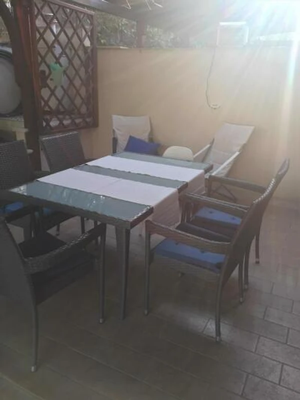 Piano terra: Soggiorno con angolo di seduta, TV, (8 posti) e accesso alla terrazza (8 mq, mobili da giardino, 1 tavolo, 10 sedie). Camera da letto con 1 letto matrimoniale. Cucina nella cucina soggiorno con zona pranzo, stufa a gas (4 fiamme), forno, lavastoviglie, frigorifero (scomparto del ghiaccio) e accesso alla terrazza. Bagno con doccia, 1 lavandino, WC, bidet e finestra.