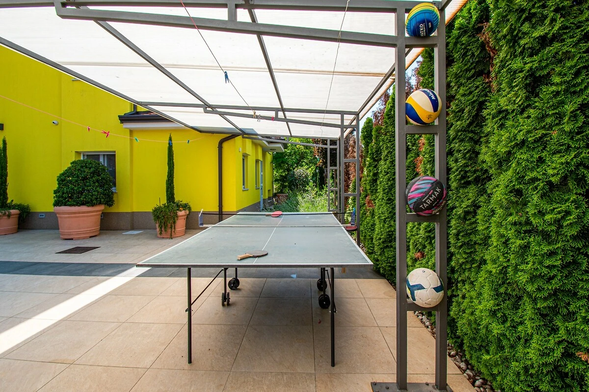 L'area esterna è circondata da numerosi divertimenti e dispone di trampolino, badmington, pikado e tavolo da ping pong. Potrete godervi la piscina rinfrescante, le sedie a sdraio, gli ombrelloni e una cucina all'aperto dove potrete preparare specialità al barbecue e gustarle sulla terrazza coperta. La casa vacanze recintata offre 2 posti auto privati recintati.