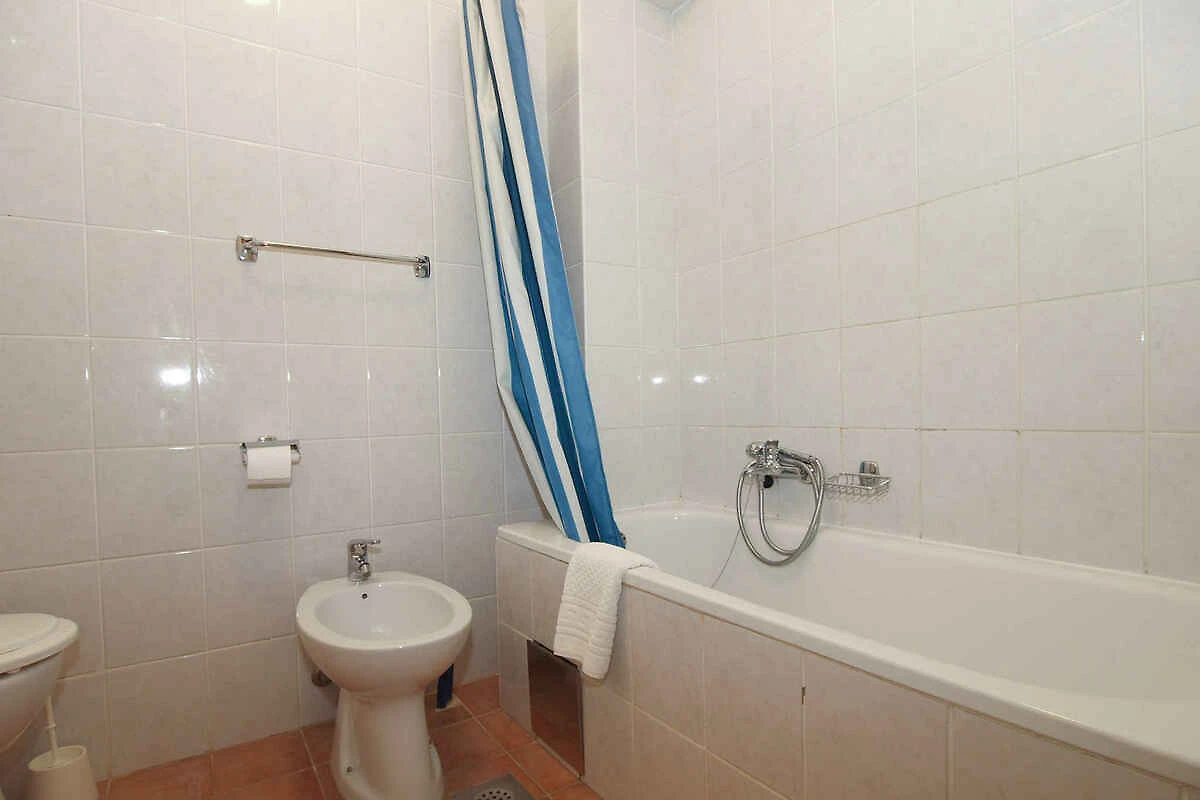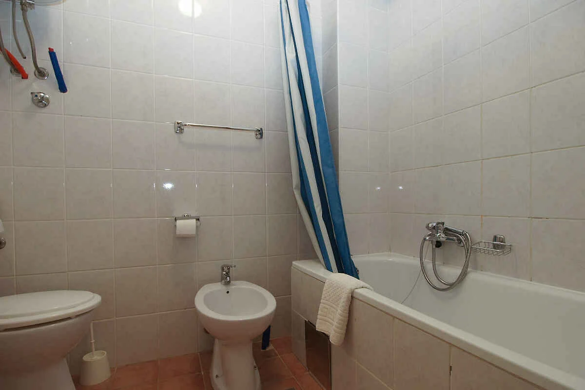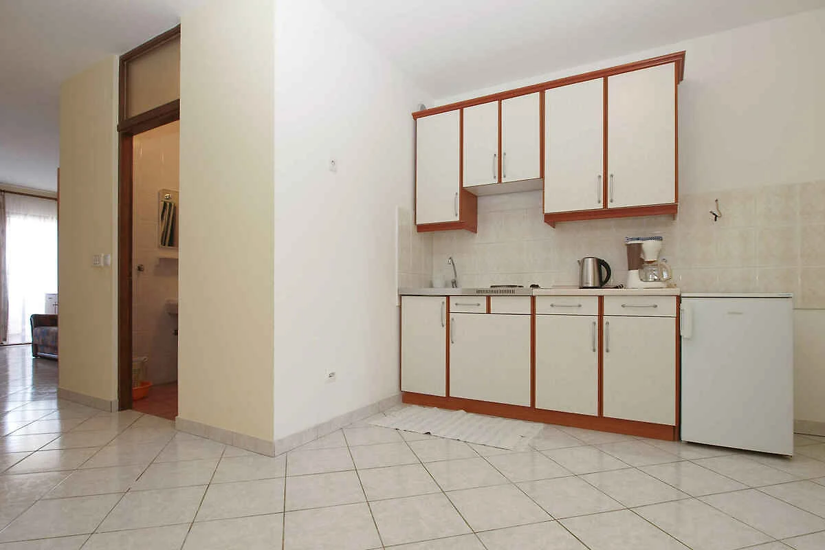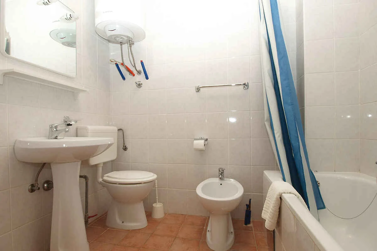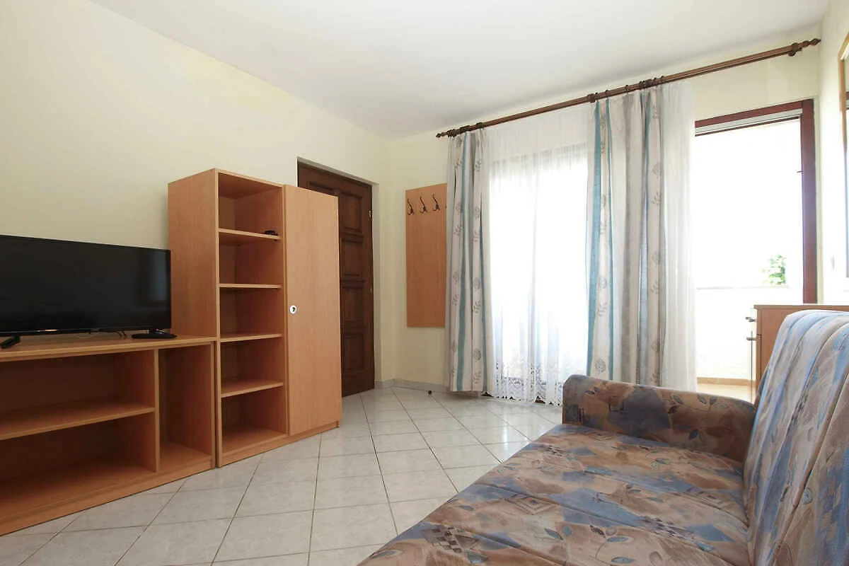 e conduce sopra una scala esterna direttamente nel soggiorno. Angolo cucina nel soggiorno con zona pranzo, stufa a gas, frigorifero, caffettiera e bollitore elettrico. Bagno con vasca da bagno, 1 lavandino, WC e bidet. Soggiorno (camera di passaggio) con 2 letti aggiuntivi su divano letto doppio, angolo di seduta, TV e zona pranzo. Camera da letto con 1 letto matrimoniale.