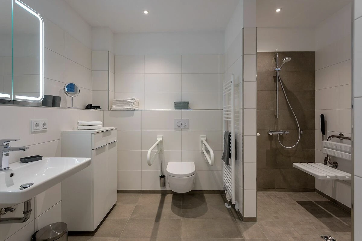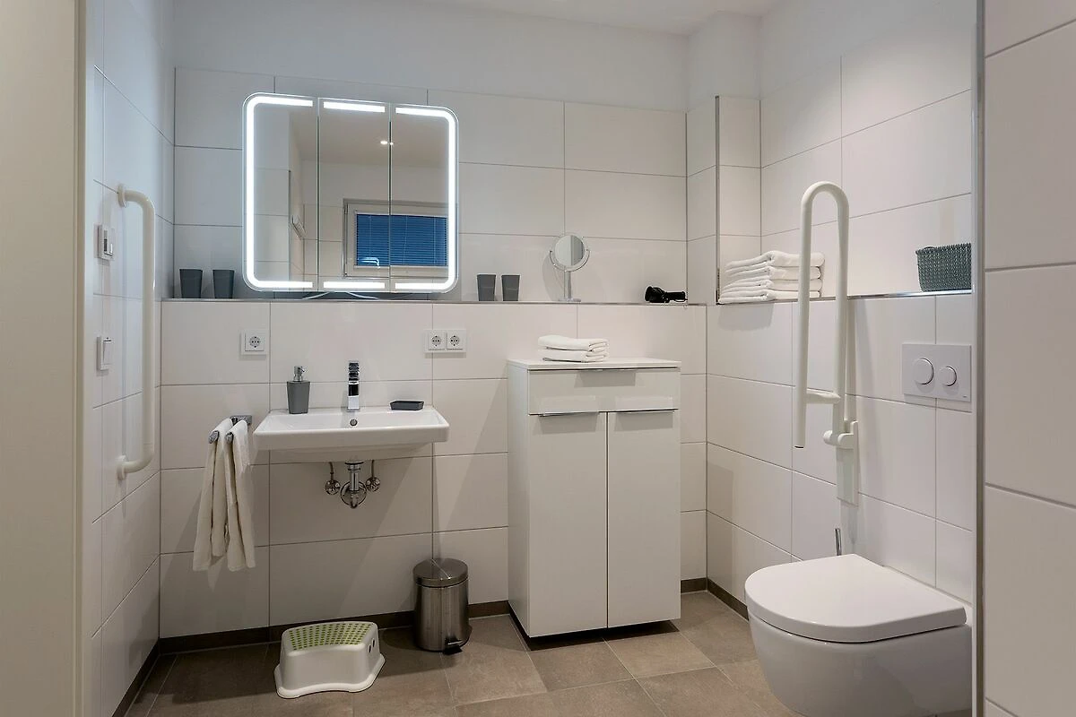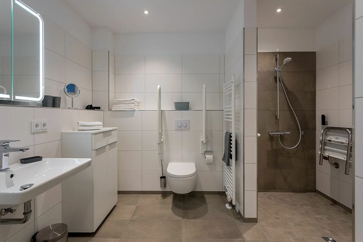 Eine super schöne Wohnung, die ideal für Rollstuhlfahrer ist. Wir haben eine Woche mit 2 Rolli-Fahrern zu viert dort verbracht und waren rundum zufrieden. Leider ist ein barrierefreier Strandzugang wohl nur in Damp vorhanden, aber der Weg dauert nur 20 Minuten von der Wohnung aus und ist über die Bundesstraße leicht gefahren. Vor Ort in Olpenitz ist der Ort barrierefrei und im Ciao Bella ist eine Schwerbehindertentoilette vorhanden, sodass wir die Unterkunft und Olpenitz selbst für Rolli-Fahrer empfehlen können.