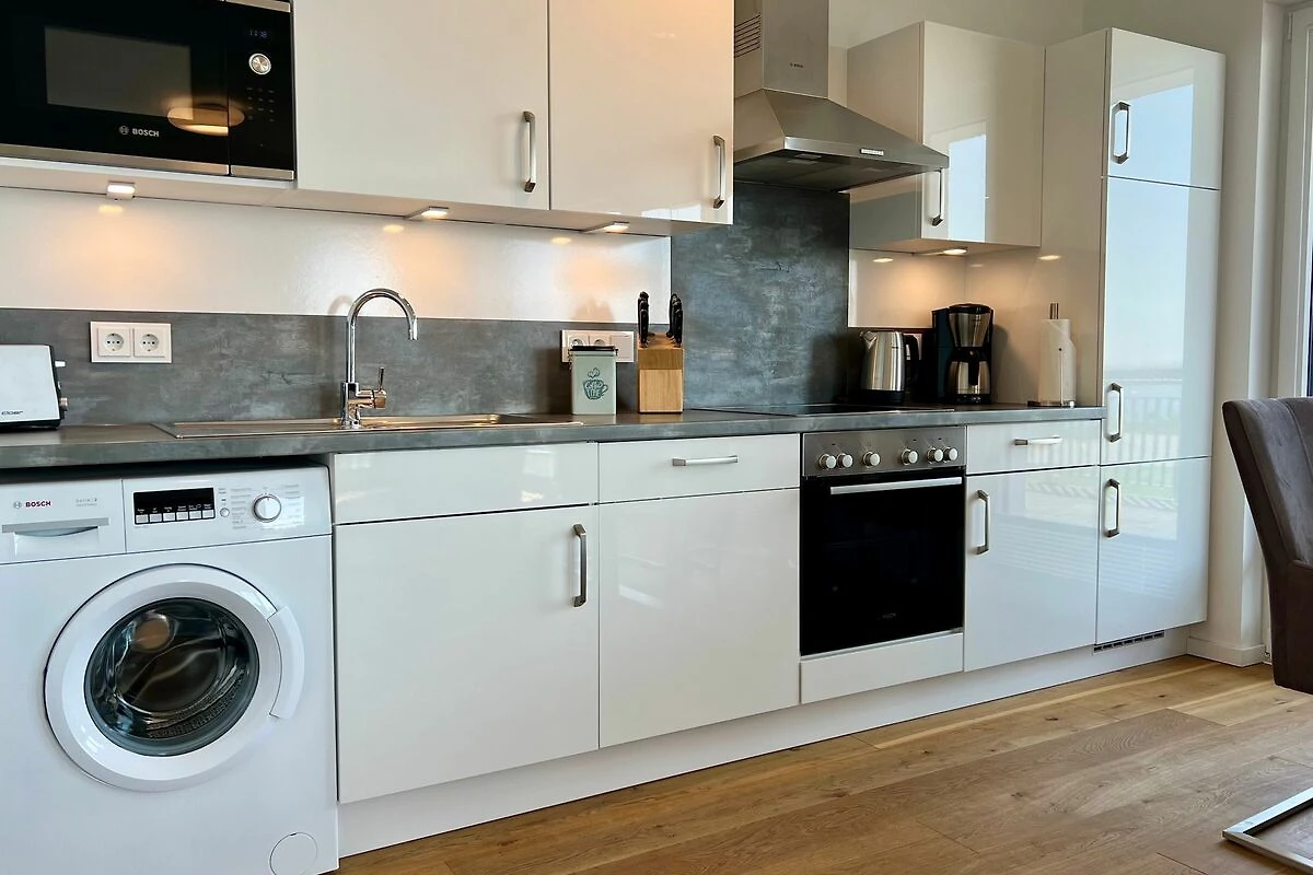 Sehr schöner Blick aufs Wasser. Die Wohnung liegt in einem Bereich, in dem derzeit nicht gebaut oder renoviert wird. Die Fotos geben die Wohnungseinrichtung korrekt wieder. Der Küchenbereich ist sehr gut ausgestattet. Richtig zu kochen ist sehr gut möglich. Mir hat der wettergeschützte Tiefgaragenplatz sehr gut gefallen. Durch zwei mit elektrischen Türöffnern zu bedienende Brandschutztüren kommt man von dort zum Fahrstuhl.