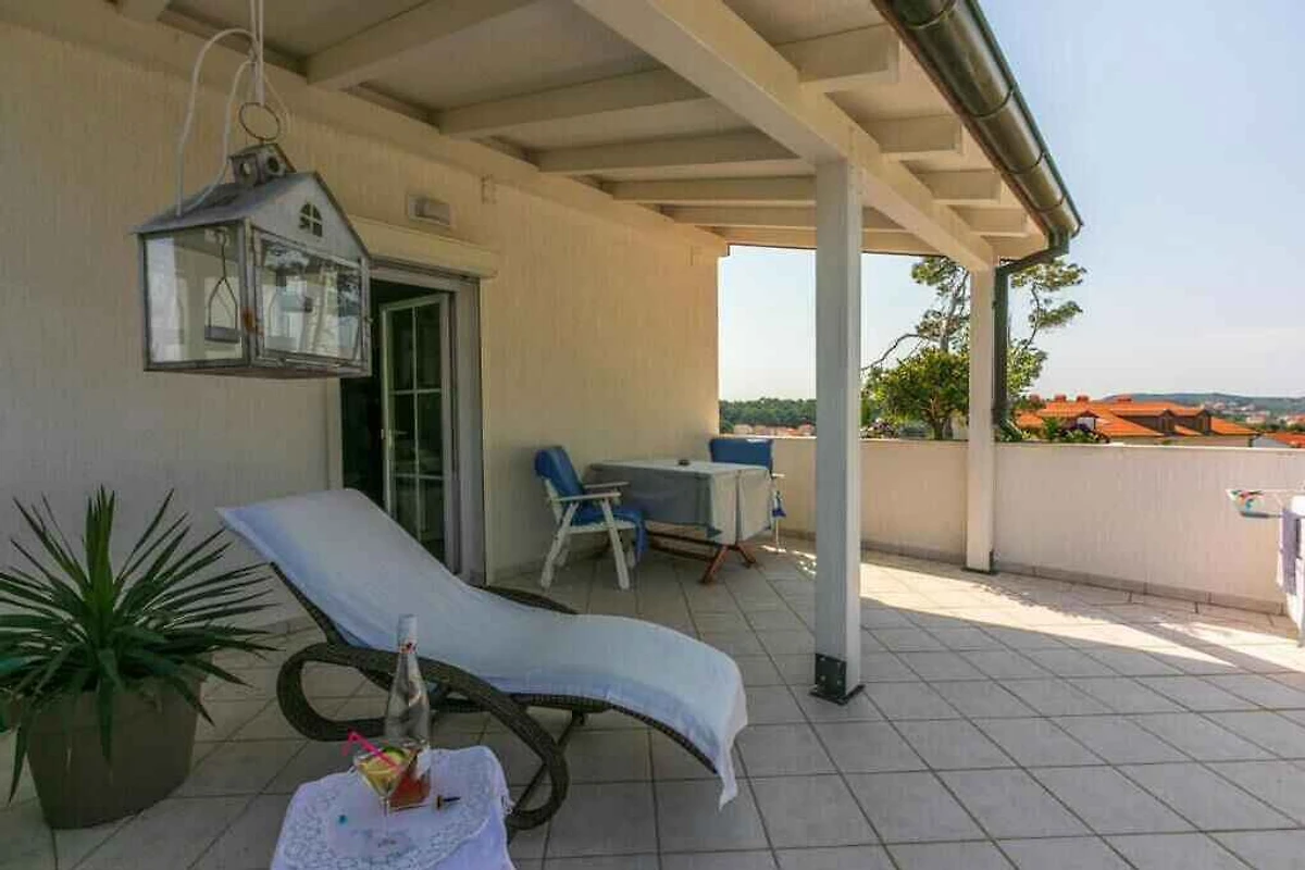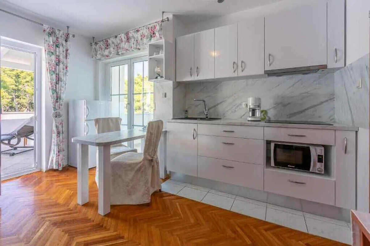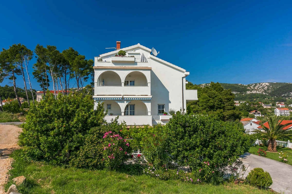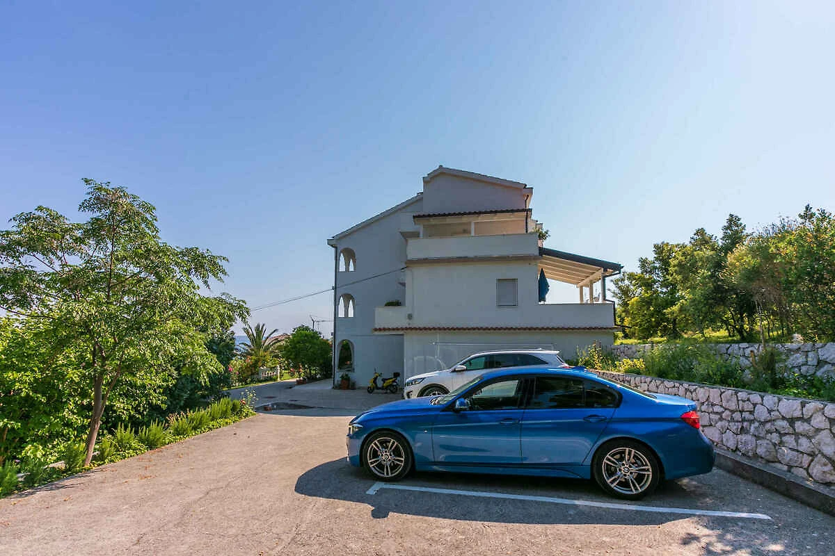 Banjol. L' appartamento vacanze si trova in una proprietá con fiori, arbusti e alberi. Vista: mare, zona verde e giardino L'accesso avviene vicino a una strada secondaria. Parcheggio sulla proprietà. Parcheggio davanti alla casa