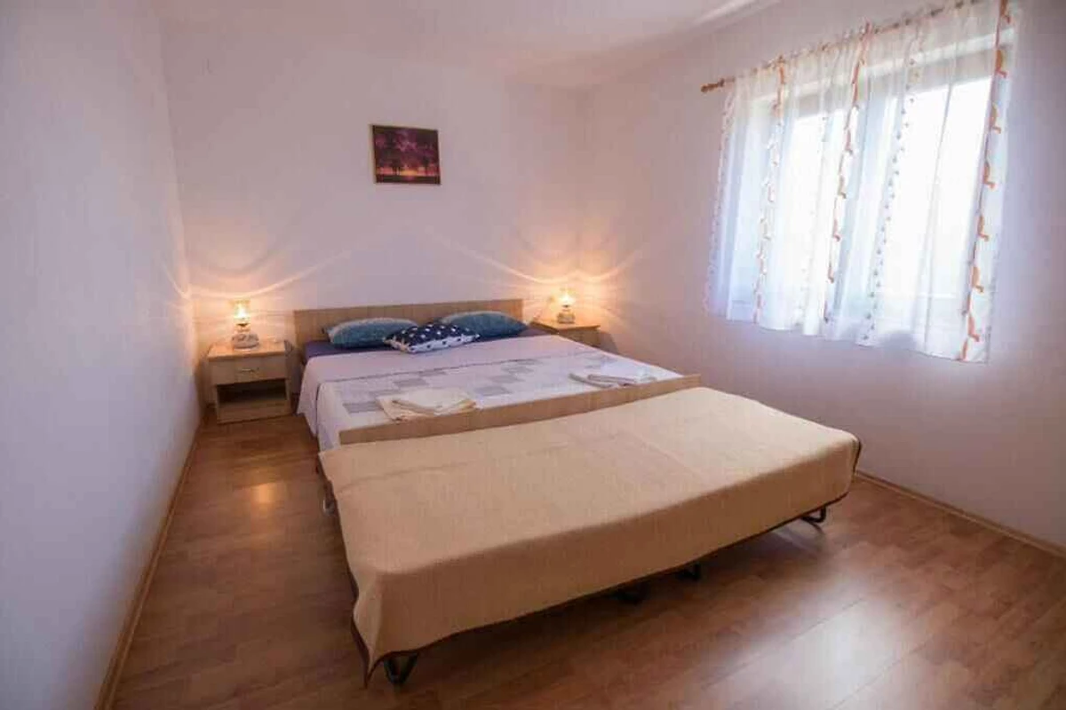 Cunski. L' appartamento vacanze si trova in una trama del giardino con fiori e alberi. Vista: Mare e spazio verde L'accesso avviene attraverso una strada (asfaltata). Parcheggio sulla proprietà.