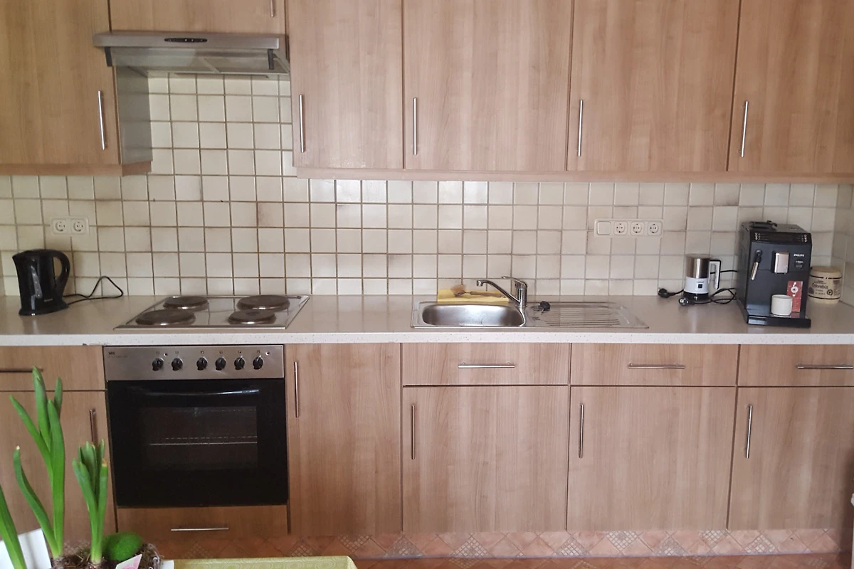 All'interno dell'appartamento troverete un'atmosfera accogliente con mobili confortevoli e toni caldi del legno. La cucina completamente attrezzata è dotata di microonde, bollitore e macchina per il caffè. La biancheria da letto e gli asciugamani sono forniti per il vostro comfort. Sono inoltre disponibili una TV e il Wifi per rimanere sempre aggiornati.
