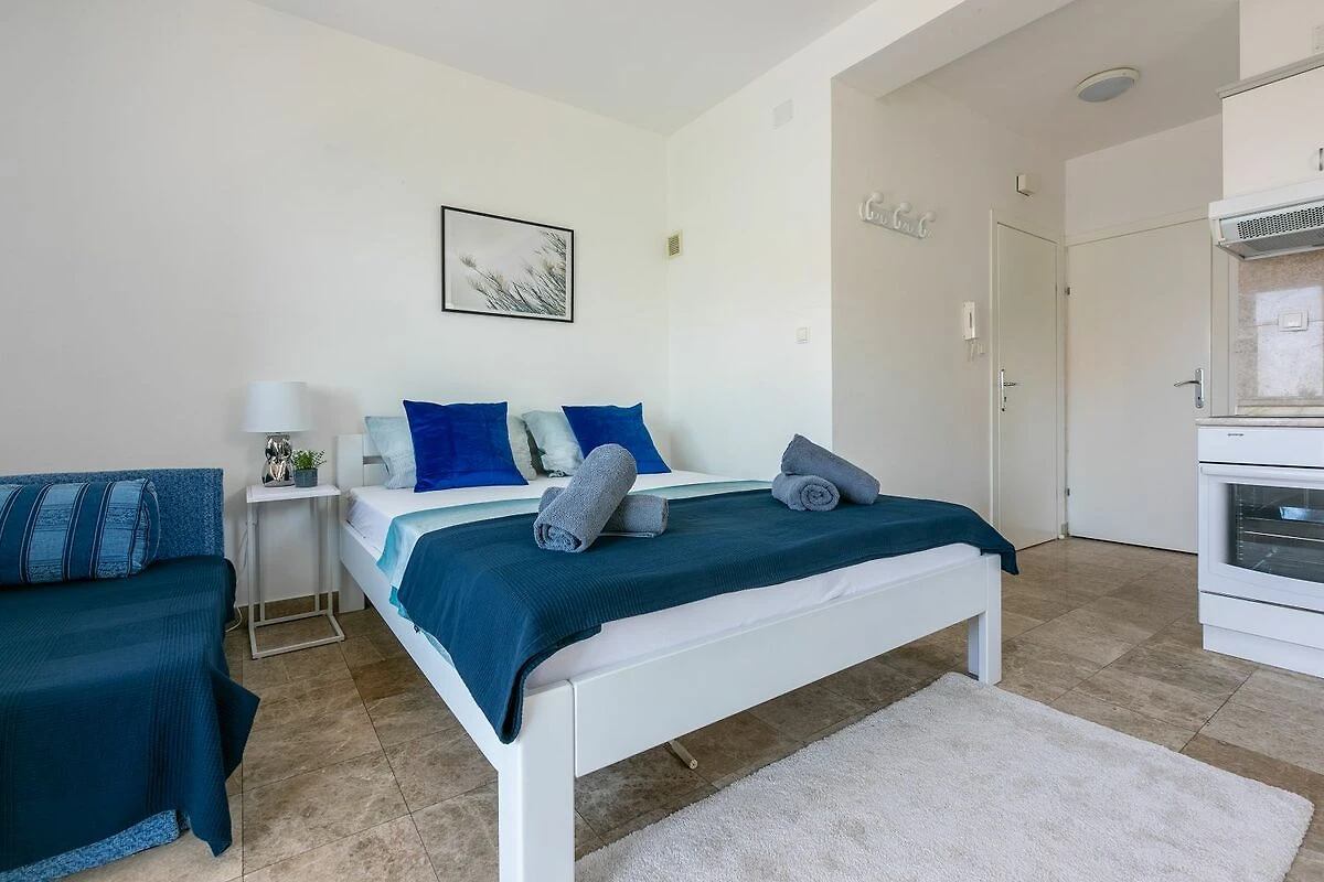 Alloggio molto ben tenuto, a soli 5 minuti a piedi dalla spiaggia e dal mare. L'appartamento è un monolocale ed è composto da un soggiorno/camera da letto con cucina e zona pranzo nella stessa stanza e un bagno. Un bel balcone coperto e dotato di tendone - da qui si può godere della vista sul mare. Ideale per una vacanza rilassante in due. Il parcheggio si trova nel parco della casa ed è gratuito.