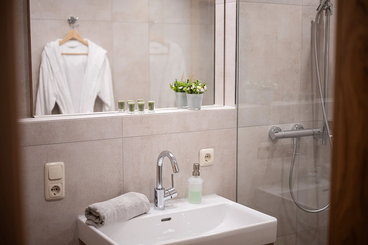 Gli appartamenti vacanze convincono per i loro interni accoglienti con tanto legno e colori caldi. La zona giorno è arredata con mobili confortevoli, una TV e un angolo cottura completamente attrezzato con lavastoviglie, microonde, bollitore e macchina per il caffè. Un grande tavolo da pranzo invita a mangiare e a socializzare. Le camere da letto sono dotate di un comodo letto e di un ampio spazio per i bagagli. Il bagno è dotato di una doccia moderna, asciugacapelli e asciugamani in abbondanza.