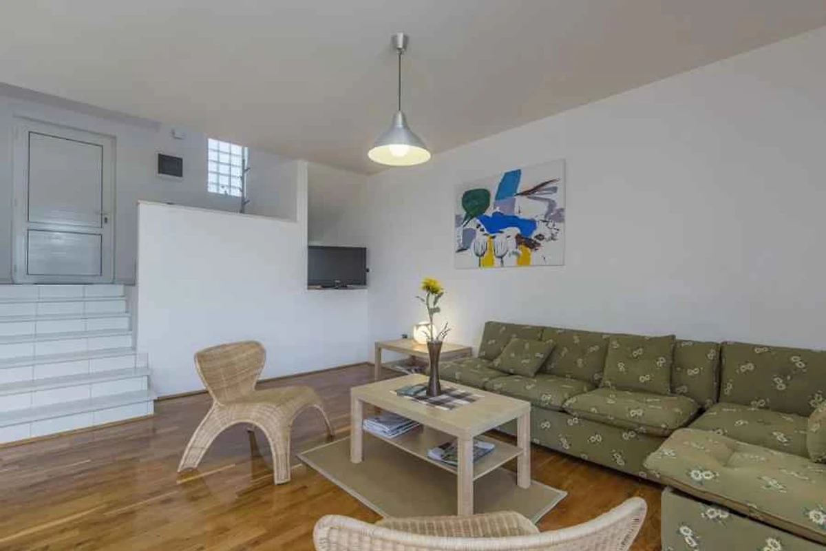 La casa vacanze indipendente è arredata moderna e pratica. La proprietà si trova in una zona residenziale, in periferia. Anche a causa della vista dalla struttura sul panorama e tranquilla e soleggiata posizione, il domicilio è popolare. Attrezzature in comune: terrazza e mobili da giardino.