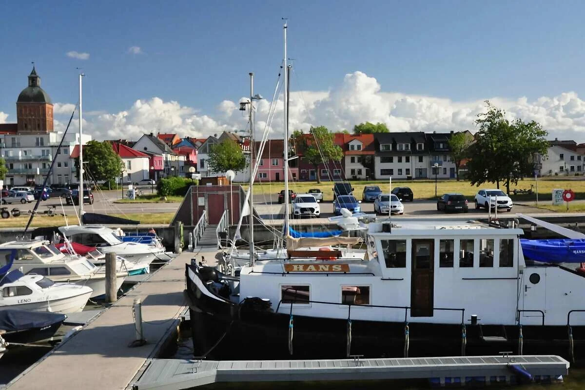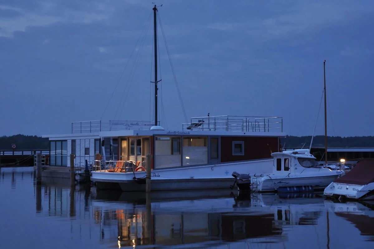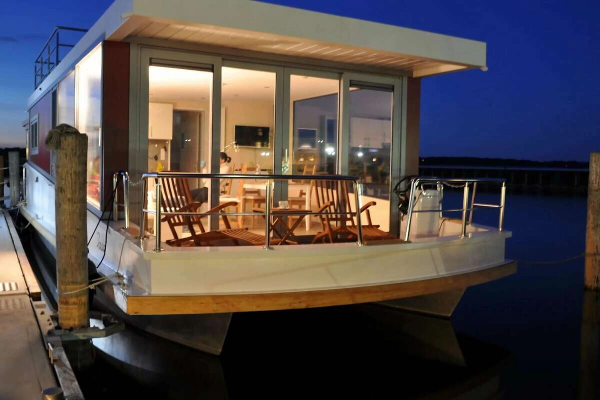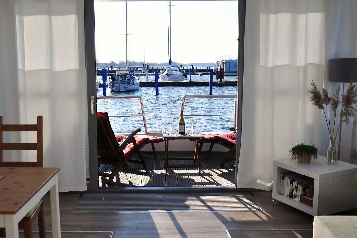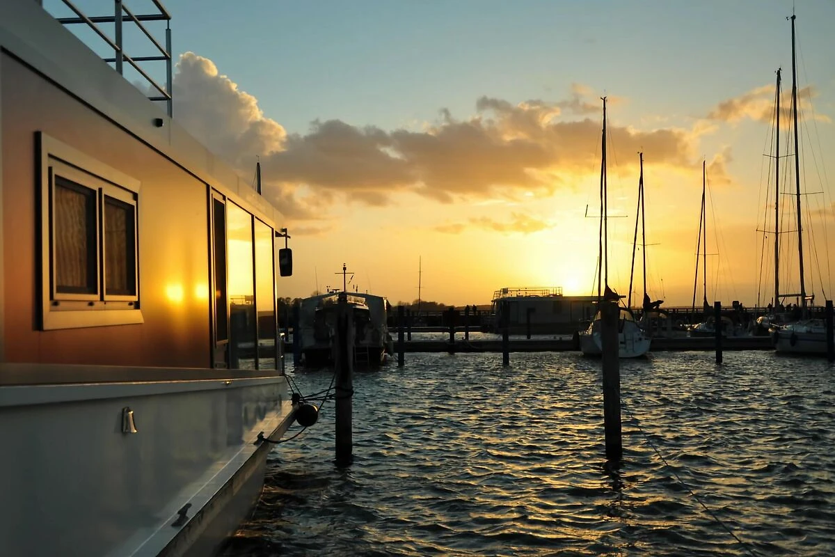 Vivi una vacanza speciale sull'acqua tra tramonti spettacolari e l'atmosfera del porto turistico sulla nostra casa galleggiante nel porto di Ribnitz.