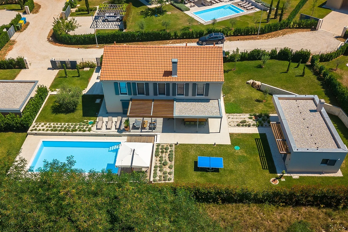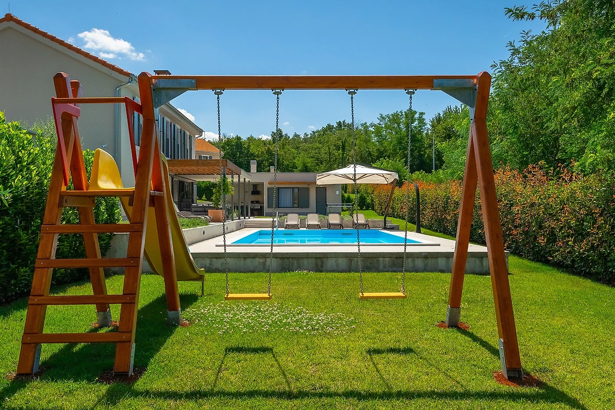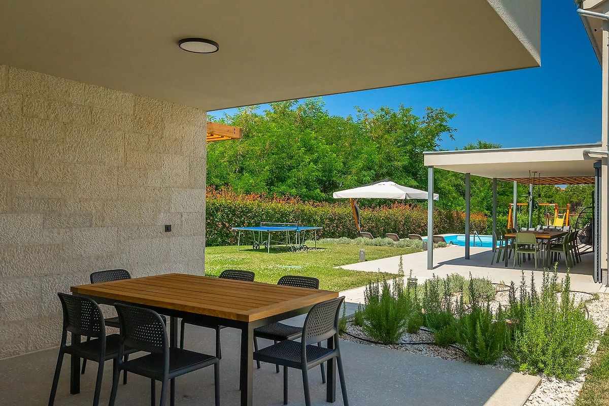 Oltre agli interni raffinati e arredati con gusto, Villa Fritula vi stupirà con il suo giardino di 1091 m² con 4 aree lounge. Accanto alla piscina di 50 m² ci sono 7 lettini, mentre sulla spaziosa terrazza esterna si trovano un tavolo da pranzo con 10 sedie, un'altalena e un comodo divano con poltrone. Accanto alla villa si trova un edificio aggiuntivo con una terrazza dotata di cucina estiva con grill e un tavolo con 6 sedie. Non c'è davvero fine al piacere in questa villa, e con così tante aree relax, c'è spazio per grandi gruppi di amici o famiglie. I bambini possono giocare nel parco giochi all'aperto e ci sono anche un set da ping-pong, attrezzature per il badminton e giochi da tavolo. L'ampio cortile è ideale per chi desidera portare in vacanza il suo animale domestico.