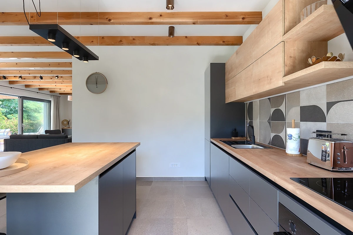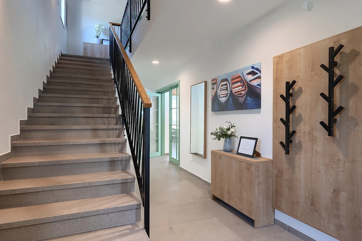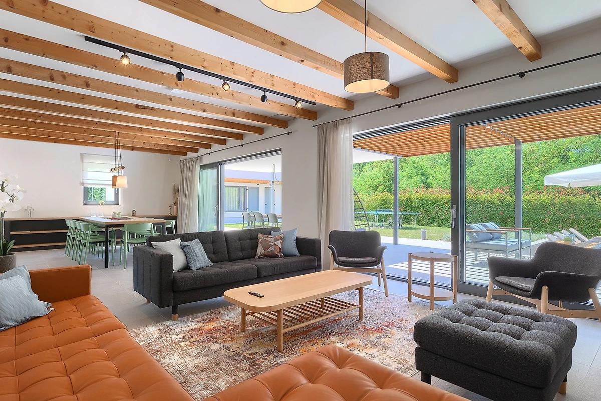 La villa ha una superficie di 164 m² ed è composta da piano terra e piano superiore. Il piano terra è caratterizzato da un arioso spazio aperto che comprende un soggiorno con zona salotto, divano e poltrone, e accanto un tavolo da pranzo con 10 posti a sedere. C'è anche una moderna cucina completamente attrezzata con altre 4 sedie. L'ambiente è dominato da colori caldi e terrosi combinati con elementi in legno e metallo. A questi si contrappone il colore pastello delle sedie e delle porte, che si sposa bene con le travi del soffitto in legno chiaro. Grandi porte di vetro corrono lungo tutta la stanza, permettendo una costante luce naturale e creando l'illusione di un collegamento tra interno ed esterno.