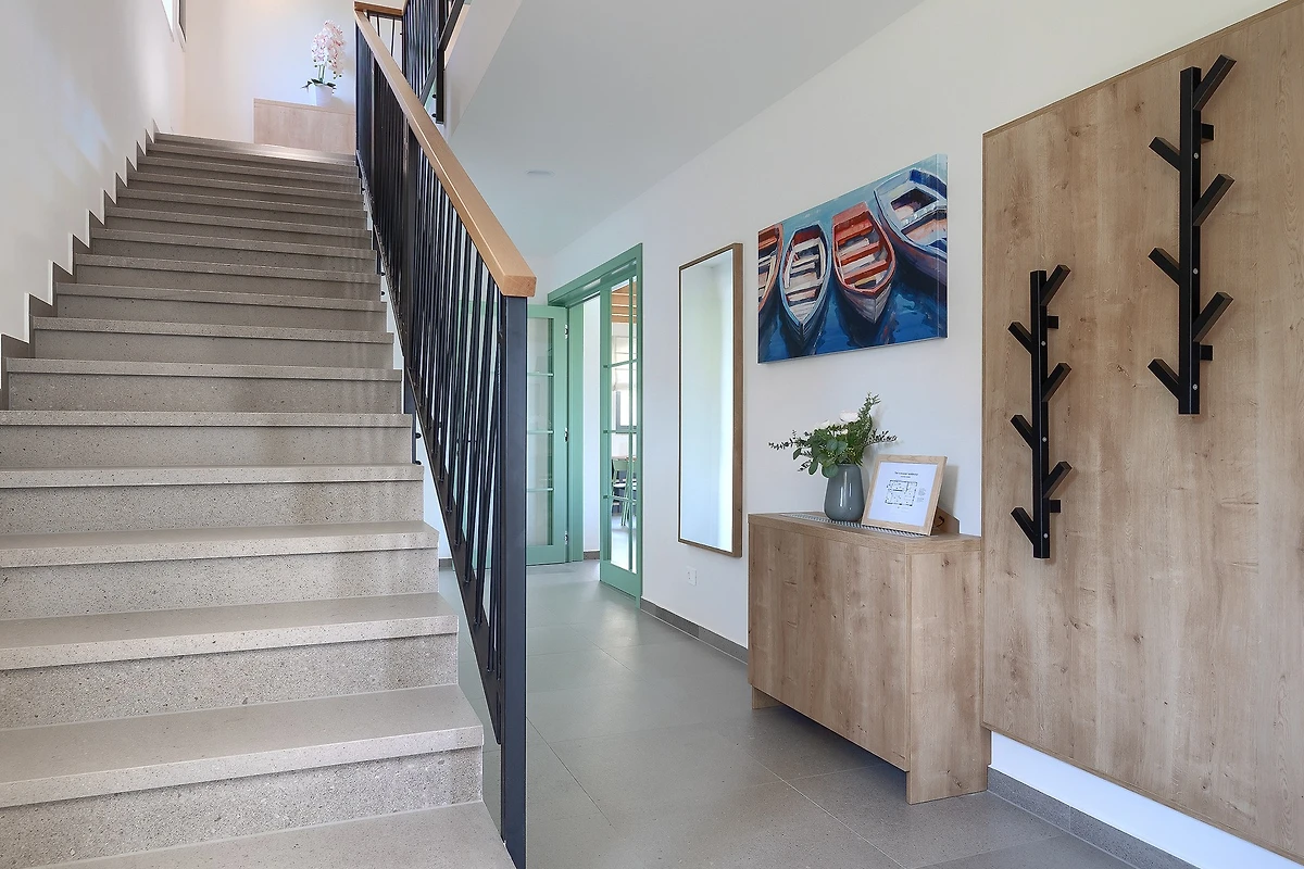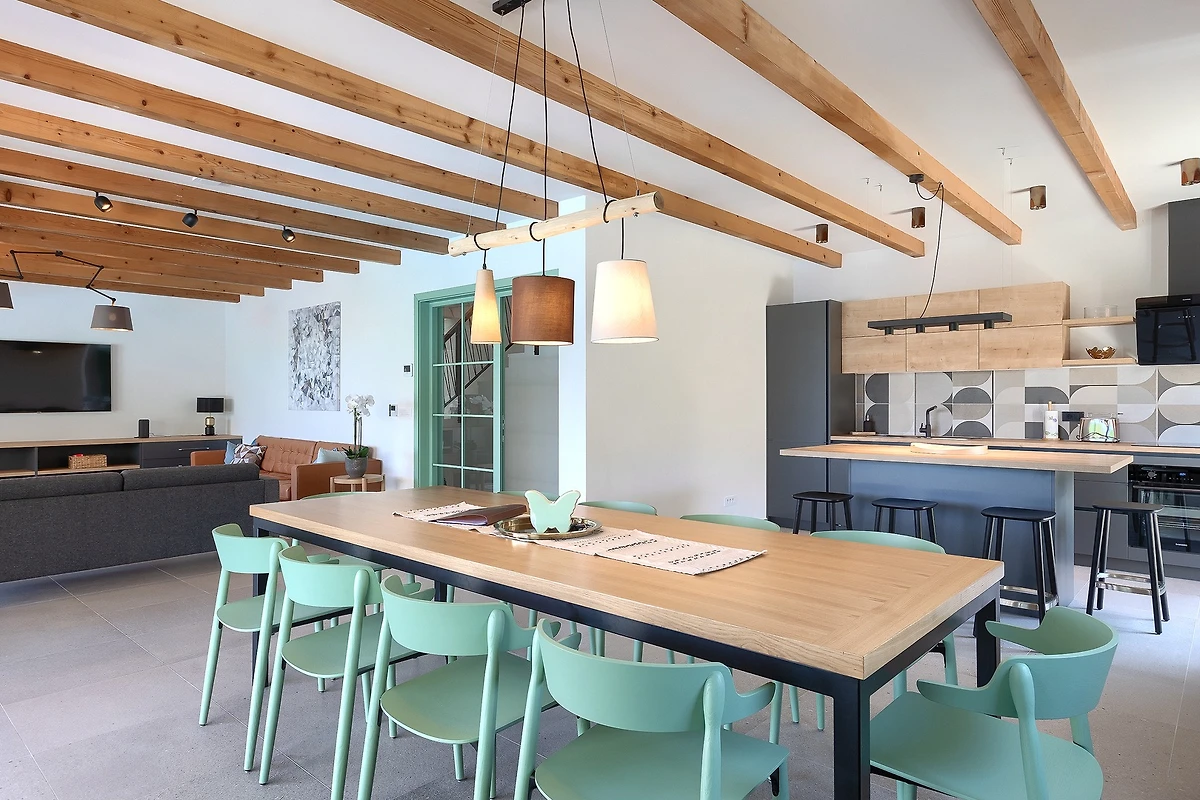 La villa ha una superficie di 165 m² ed è composta da piano terra e piano superiore. Il piano terra è caratterizzato da un arioso spazio aperto che comprende un soggiorno con zona salotto, divano e poltrone, e accanto un tavolo da pranzo con 10 posti a sedere. C'è anche una moderna cucina completamente attrezzata con altre 4 sedie. L'ambiente è dominato da colori caldi e terrosi combinati con elementi in legno e metallo. A questi si contrappone il colore pastello delle sedie e delle porte, che si sposa bene con le travi del soffitto in legno chiaro. Grandi porte di vetro corrono lungo tutta la stanza, permettendo una costante luce naturale e creando l'illusione di un collegamento tra interno ed esterno.
