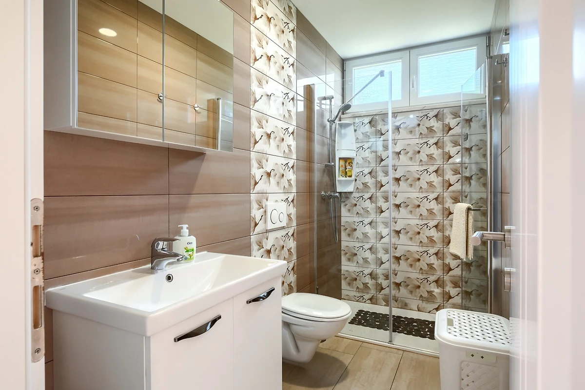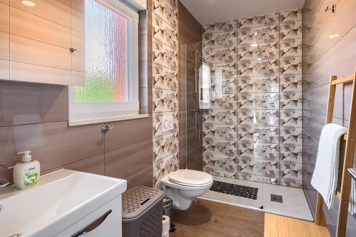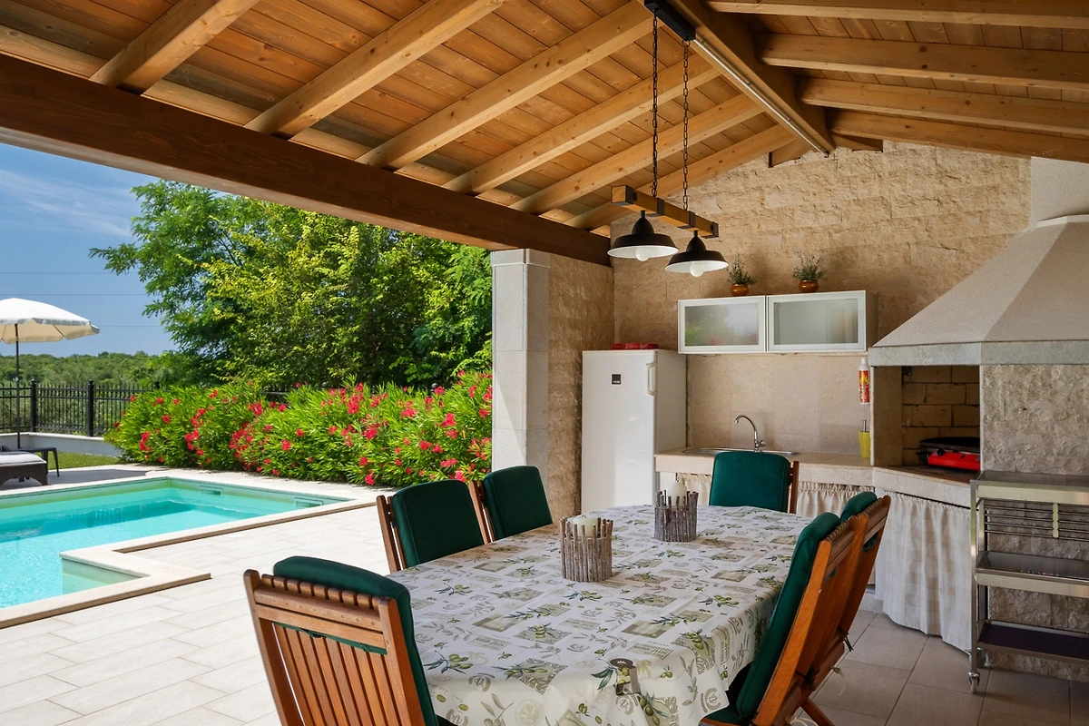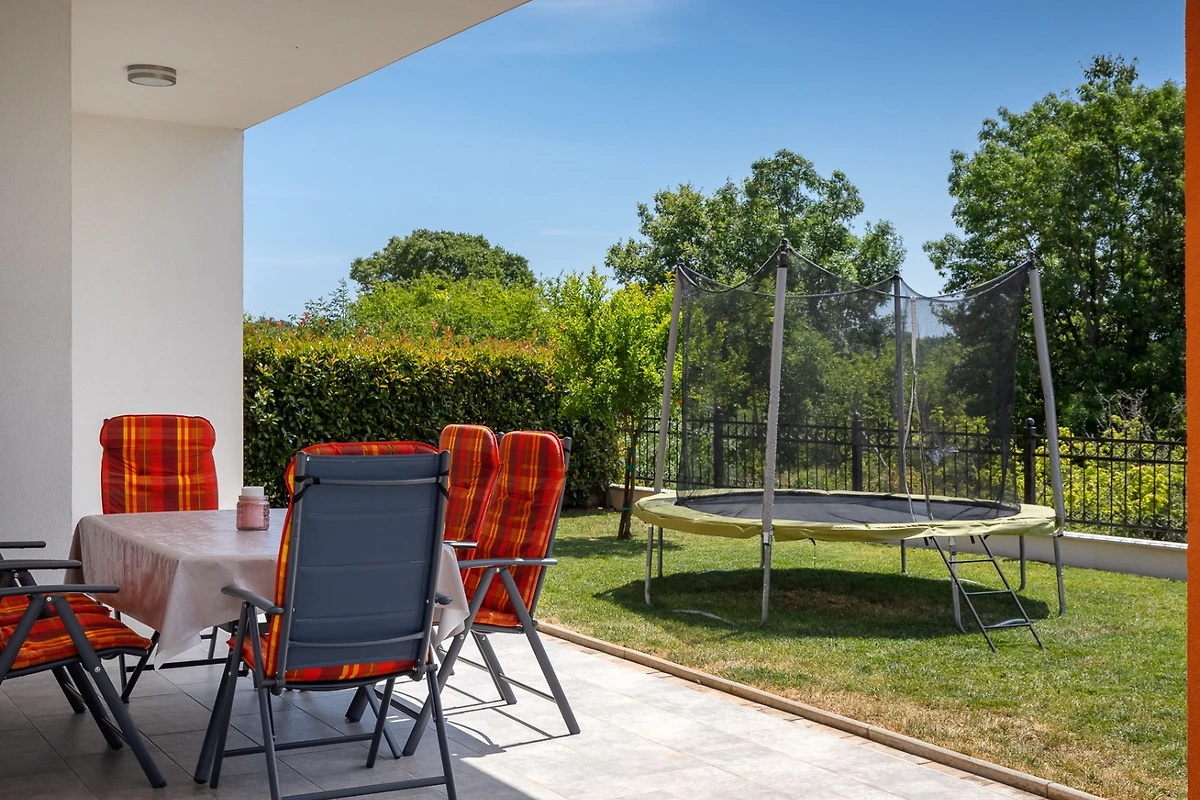 Nel cortile recintato è possibile parcheggiare fino a 4 veicoli, con una presa per le macchine elettriche. Il vialetto è adatto a veicoli sportivi con telaio ribassato. Dall'altra parte del cortile si trova un idilliaco giardino pieno di verde con vista sulla campagna istriana. Il punto forte di quest'area è l'invitante piscina esterna, perfetta per rinfrescarsi nelle calde giornate estive. Gli asciugamani e la doccia esterna sono a vostra disposizione, mentre le comode sedie a sdraio sono il luogo ideale per godersi il sole istriano mentre si legge il proprio libro preferito. Adiacente alla piscina, c'è una cucina estiva coperta e una sala da pranzo. La cucina è dotata di tutto il necessario e di una griglia a gas per cucinare all'aperto, mentre il grande tavolo è perfetto per le riunioni sociali e le chiacchiere notturne mentre si gustano cibi deliziosi. C'è anche un trampolino per il divertimento dei vostri piccoli, che sono sempre alla ricerca di nuove avventure.